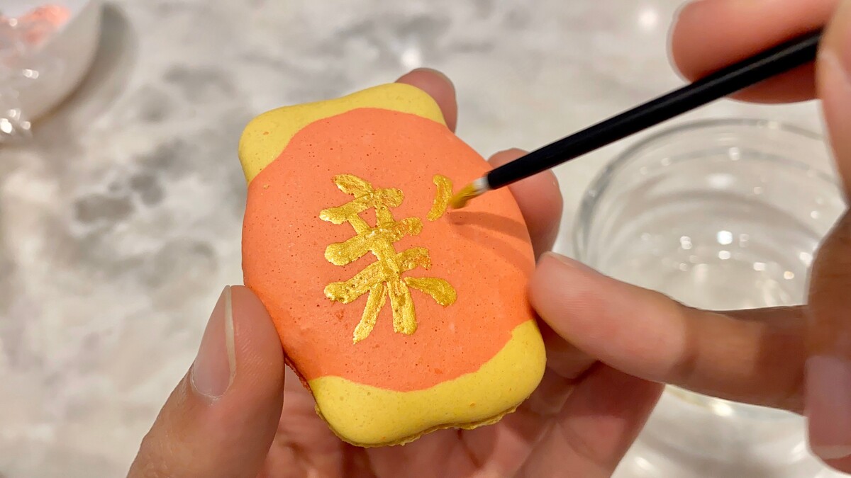 外頭以食用金漆寫上喜氣文字,考驗大家吉祥話造句能力,也可以描繪可愛的圖案~