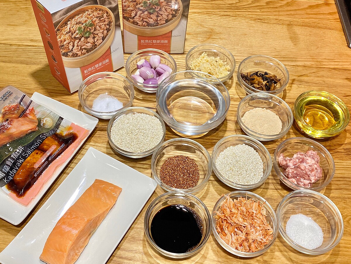 美威鮭魚60克、美威蒲燒鮭魚排135克、大豆油20克、香菇180克、豬絞肉34克、蒜5克、紅蔥頭15克、砂糖7克、鹽6克、水130克、醬油60克、櫻花蝦15克、長糯米150克、圓糯米50克、紅藜麥15克、白胡椒少許