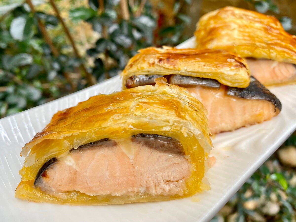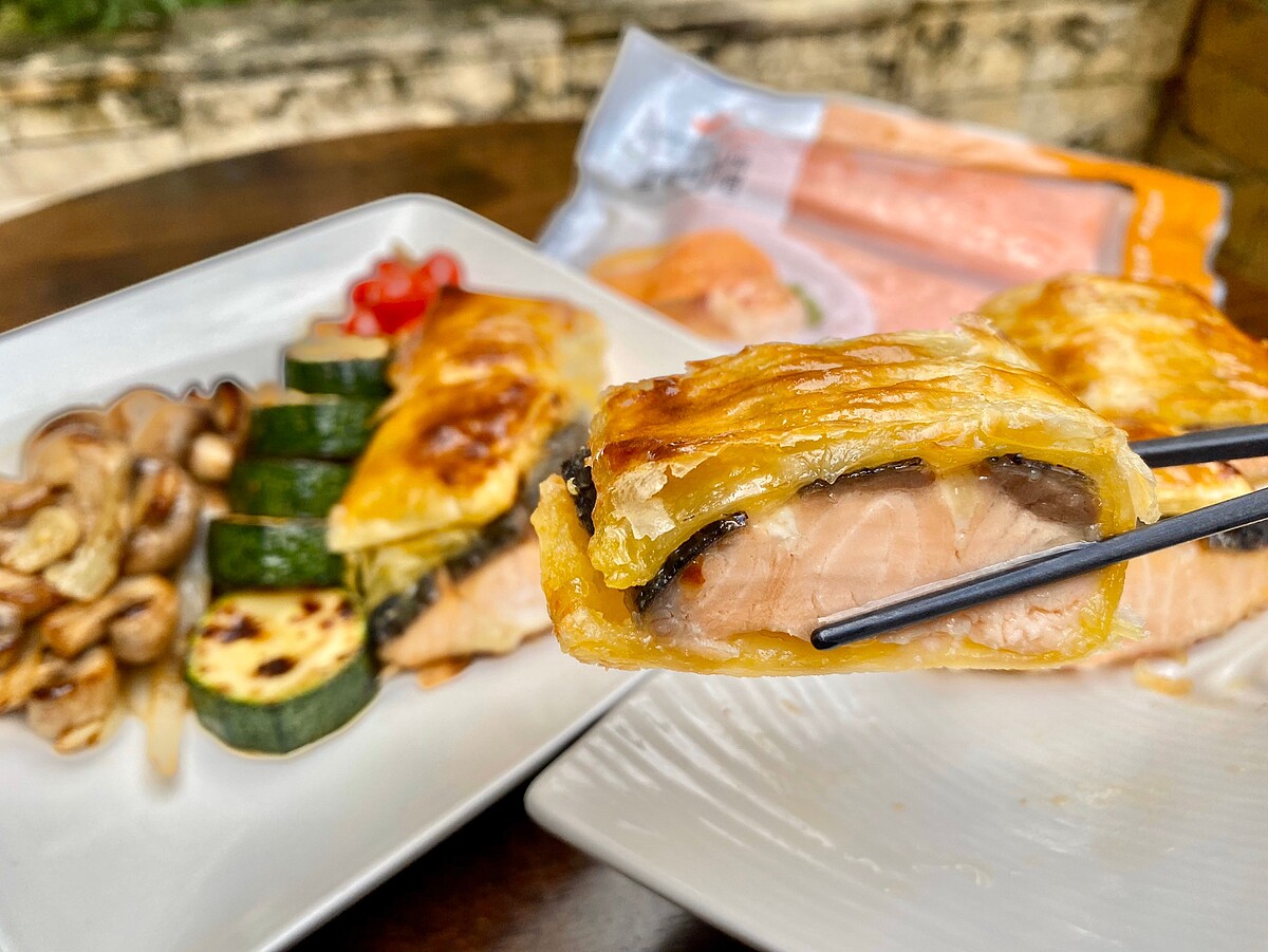 - 酥皮鋪底將鮭魚包起後塗抹蛋黃,放入預熱好的烤箱210度烤約10分鐘。