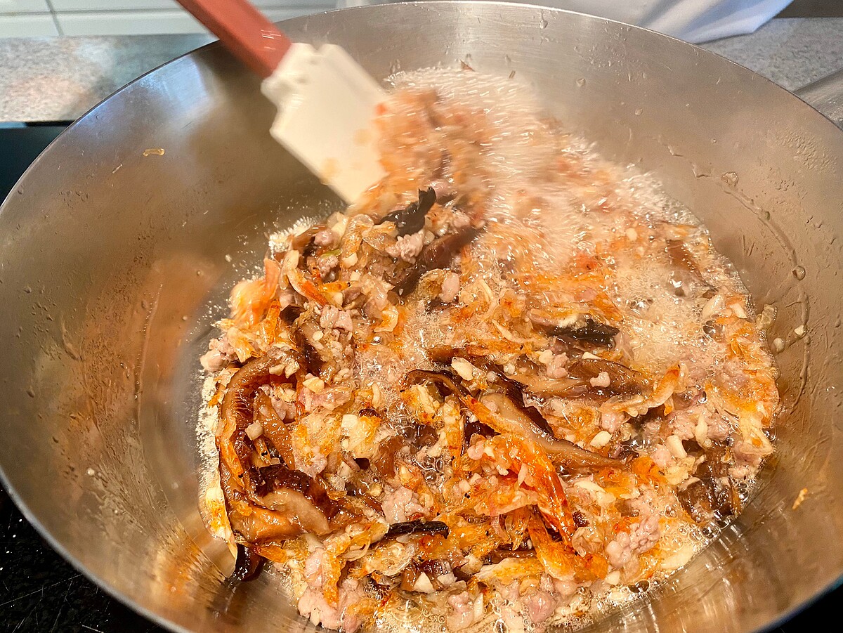 - 取鍋倒油,依序放入紅蔥頭、香菇、豬絞肉、蒜、櫻花蝦炒香。