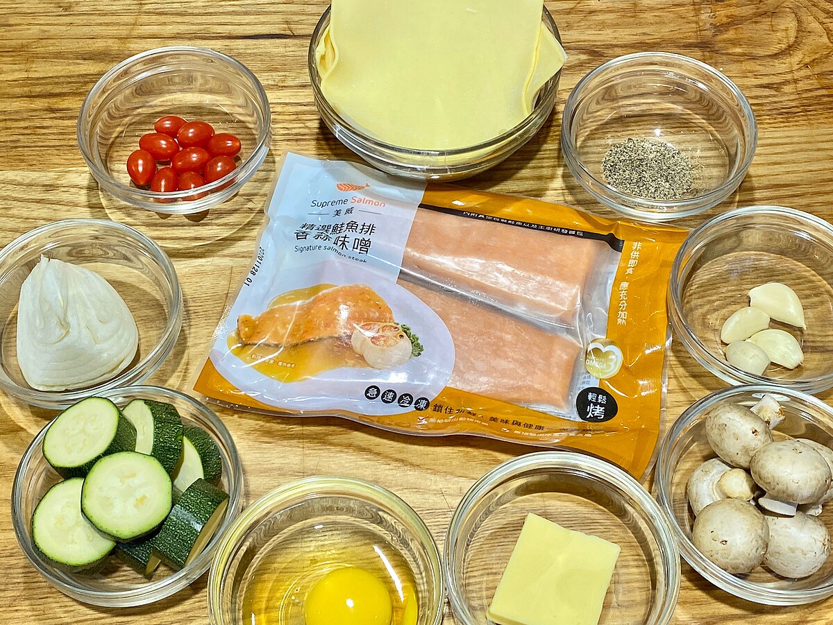 美威鮭魚排2片(240克)、香蒜味噌醬(50克)、酥皮2片、洋菇60克、蒜10克、鹽少許、黑胡椒粒少許、洋蔥60克、奶油15克、綠櫛瓜30克、雞蛋一顆、橄欖油15克、小番茄2顆
