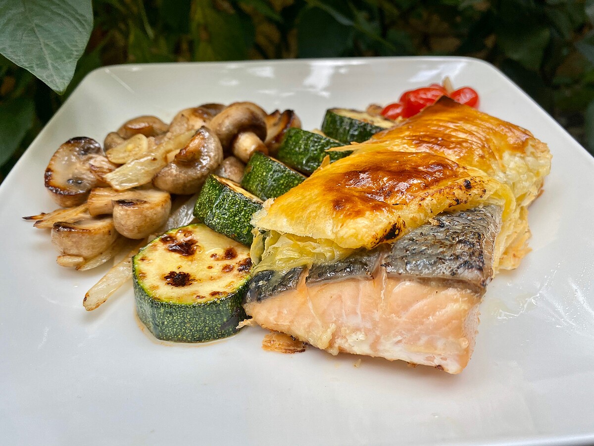 美威鮭魚排2片(240克)、香蒜味噌醬(50克)、酥皮2片、洋菇60克、蒜10克、鹽少許、黑胡椒粒少許、洋蔥60克、奶油15克、綠櫛瓜30克、雞蛋一顆、橄欖油15克、小番茄2顆