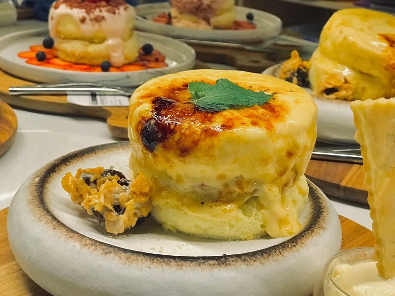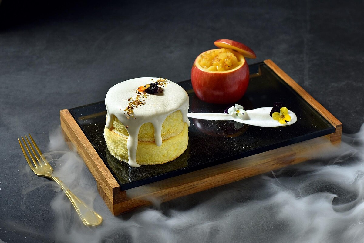 成真咖啡明星商品舒芙蕾,選用日本紫羅蘭麵粉、義大利進口起司,淋上主廚研發酒釀桂花奶霜,搭配白蘭地酒漬肉桂蘋果,上桌時有炊煙裊裊,體驗與口感兼具,現點現做的好滋味!