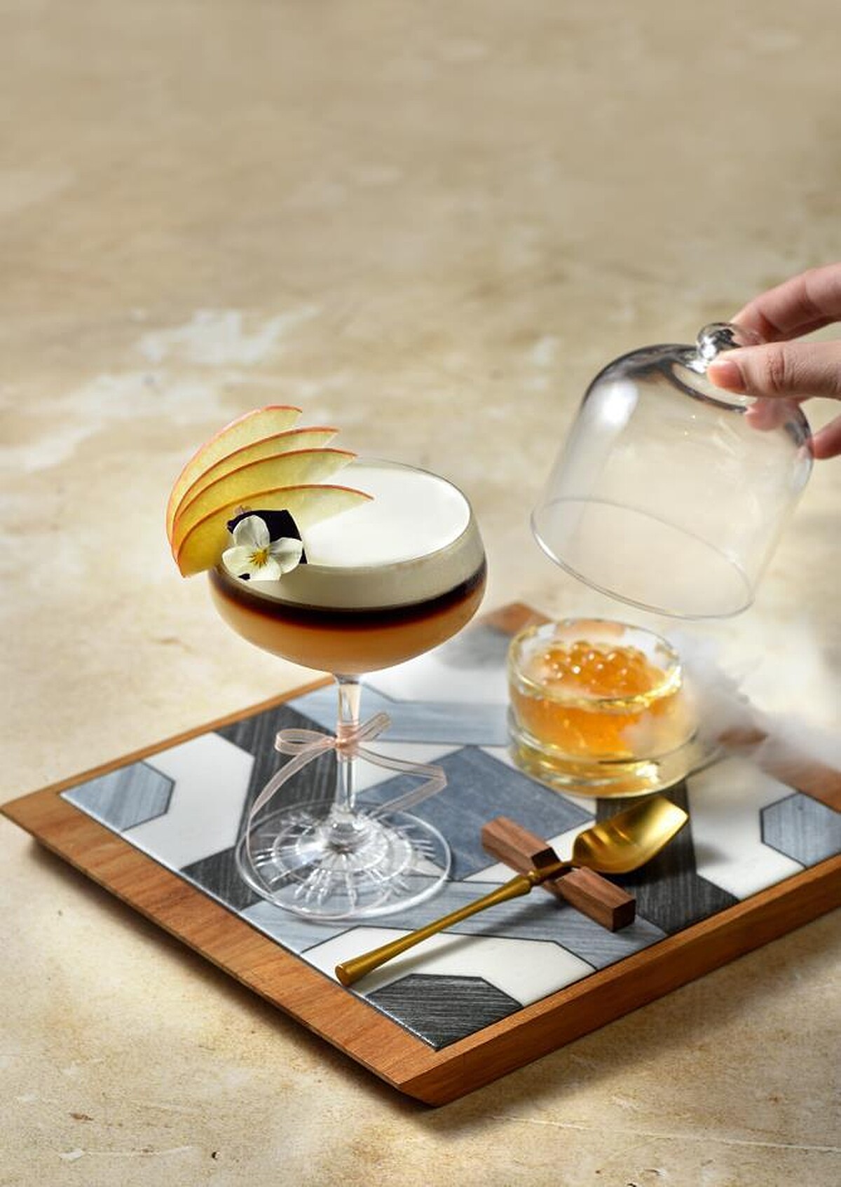 以日本青森100%蘋果汁,加入些許橙酒提味,融合義式咖啡並淋上蘋果奶霜,並研發蘋果晶球分子,取代珍珠的口感,清爽滋味健康無負擔!