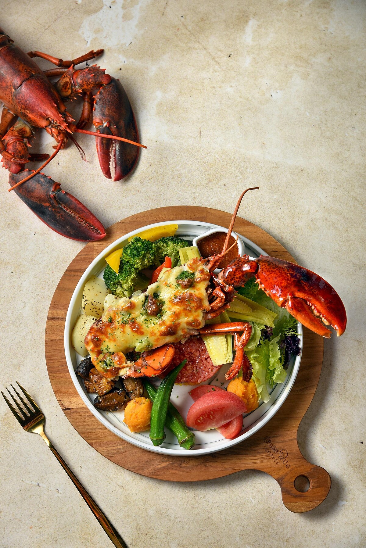 嚴選波士頓龍蝦佐以特製醬汁焗烤,搭配新鮮蔬菜簡單調味,底層為層層堆起的彩虹飯,米飯選用口感Q彈的彰化冠軍馥米,紅麴、紅藜麥和薑黃飯層次組合,飽餐又均衡!