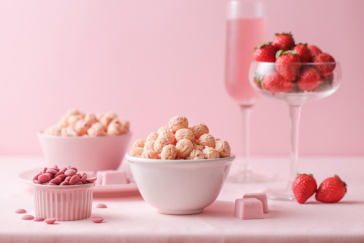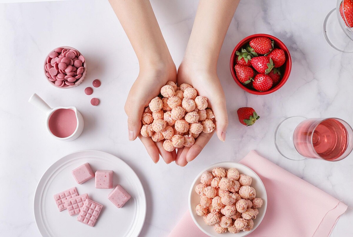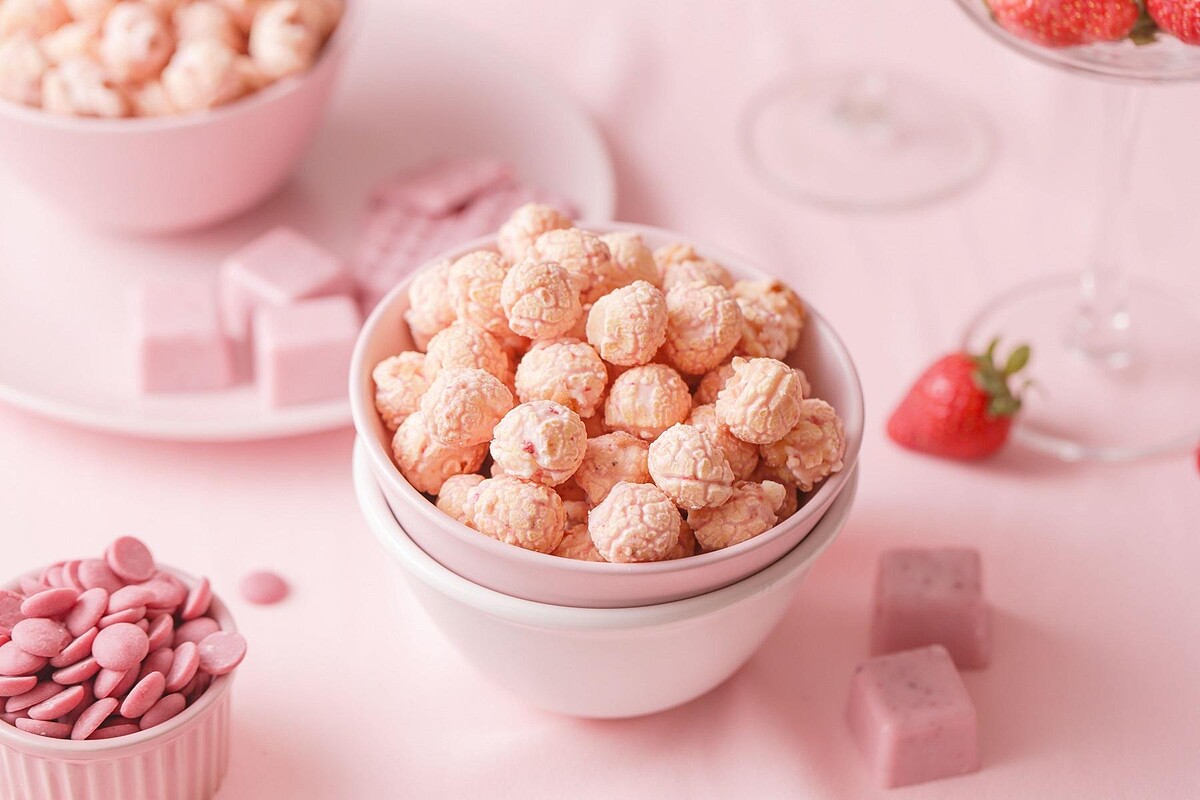 最後撒上乾燥草莓碎粒與櫻花粉,超幸福的雙重口感在嘴中化開,一入口則散發出濃郁莓果香氣,草莓的微酸與紅寶石巧克力的香甜,讓爆米花口感極具層次。美味與顏值兼具的完美組合,情人節告白的神助攻,讓這份禮物瞬間GET少女心!