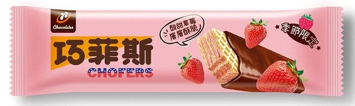 被譽為CP值超高的巧菲斯,香醇可可包裏酥脆威化,搭配草莓夾心豐富又滿足~