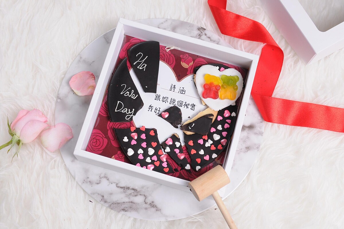 將心意愛意親筆寫下,或是放上幸福合照,最後以紅色緞帶乘載你滿滿的愛意。如何讓心愛的他,清楚明白你的敲敲話?拿起隨盒附贈的敲敲槌,輕敲巧克力,甜言蜜語立刻正中紅心!
