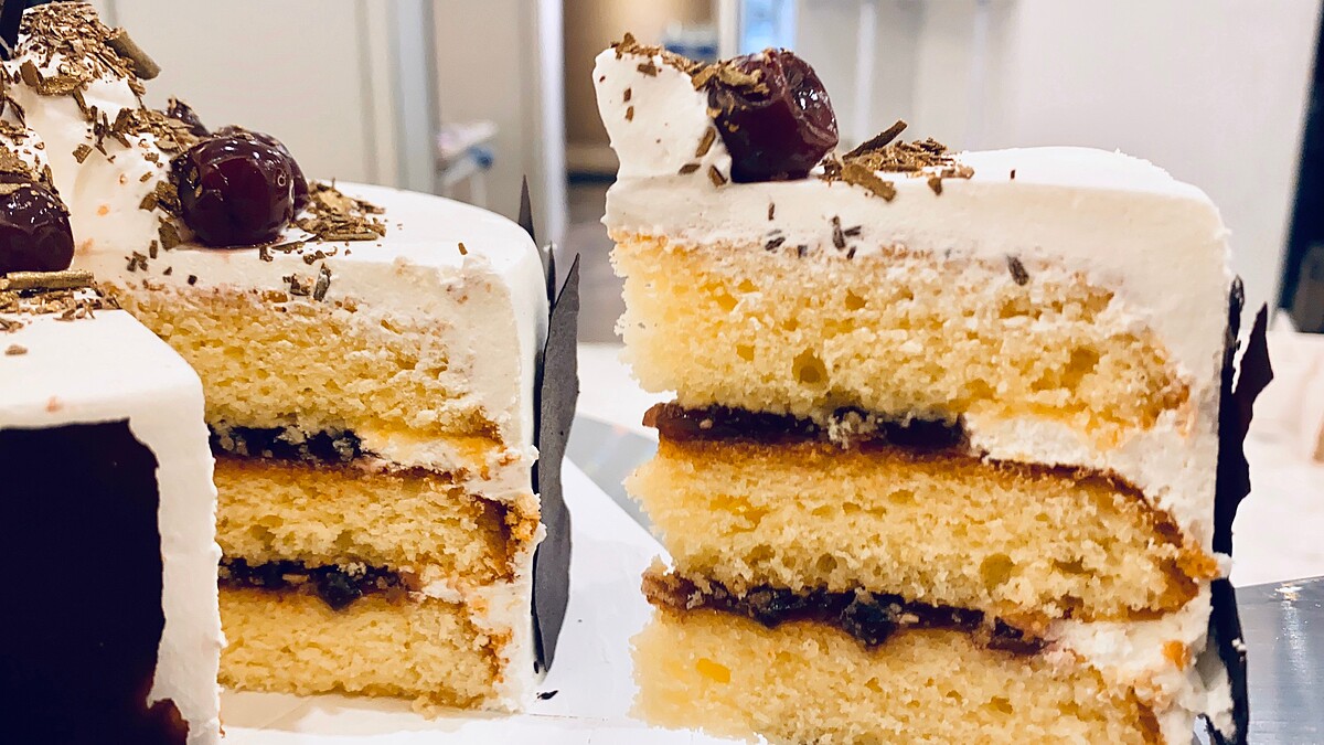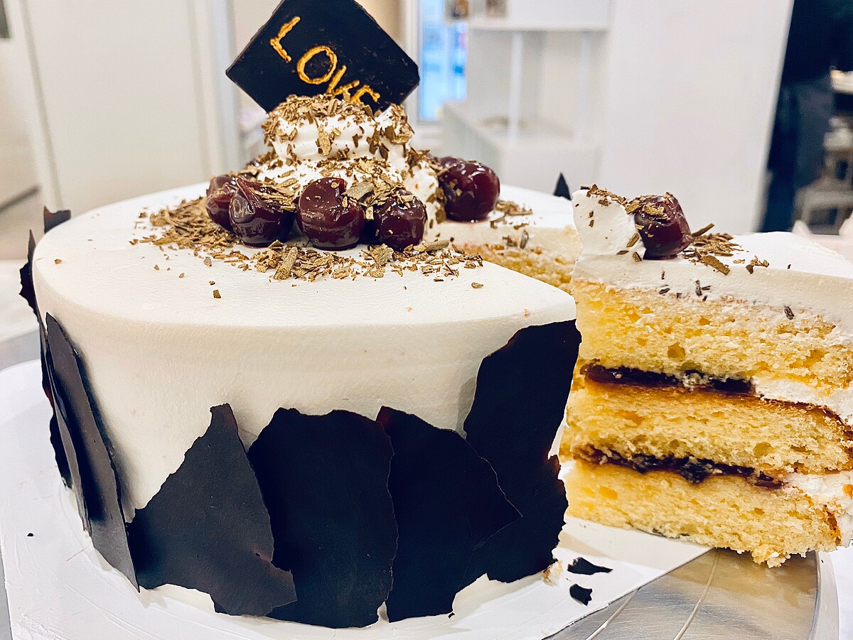 給以口感扎實的美式黃蛋糕為基底,佐以檸檬汁增加濕潤口感與風味,夾層為藍莓果餡,蛋糕側邊裝飾上不規則苦甜巧克力片,加上頂端一顆顆酒漬櫻桃!