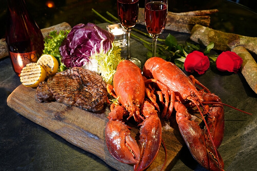板橋凱撒大飯店2樓的卡拉拉餐廳,在情人節當天推出限定一天的「濃情經典雙饗宴」,除了有12道西班牙TAPAS開胃小點,還能大嗑碳烤頂級美國肋眼牛排或香料奶油焗龍蝦、甜蜜初戀草莓披薩、義式粉紅牧師帽餃與手工創意蘋果塔與情人調酒,讓情侶沈浸在粉紅泡泡中,雙人售價2280元。