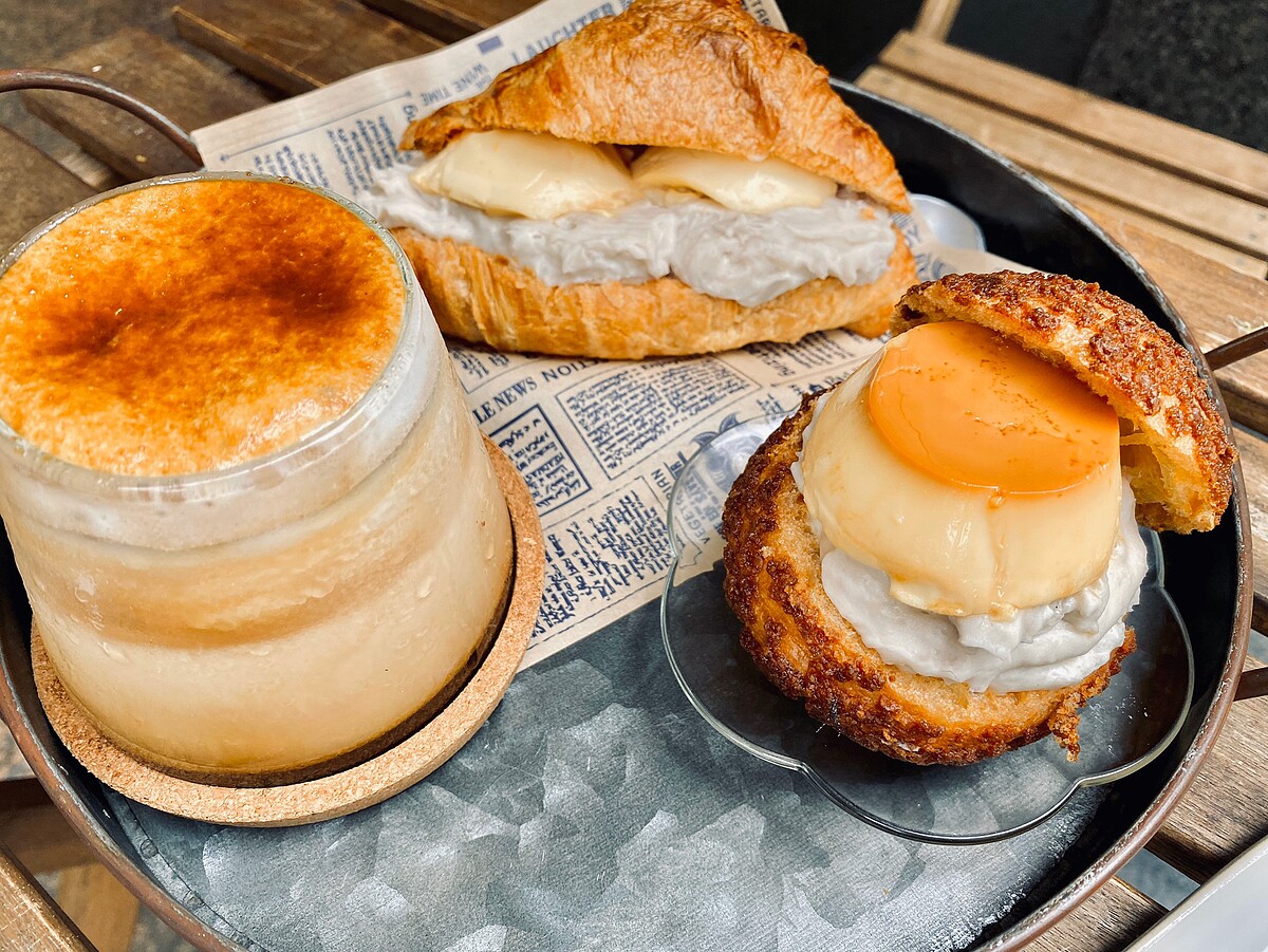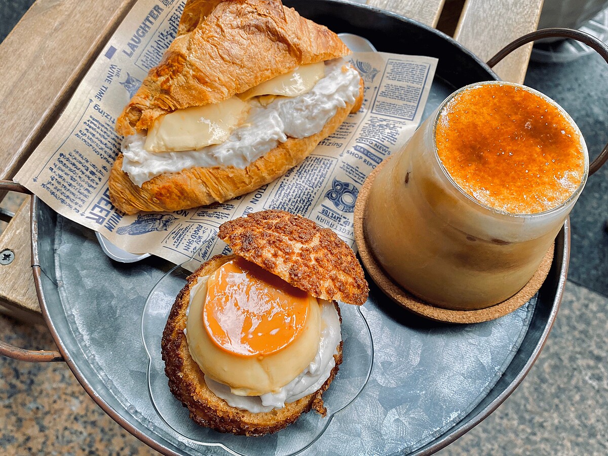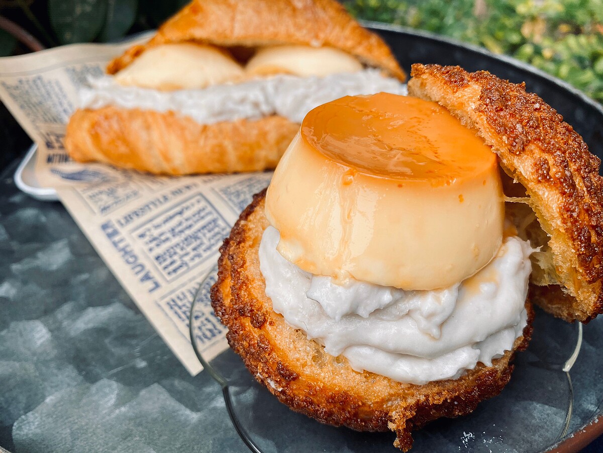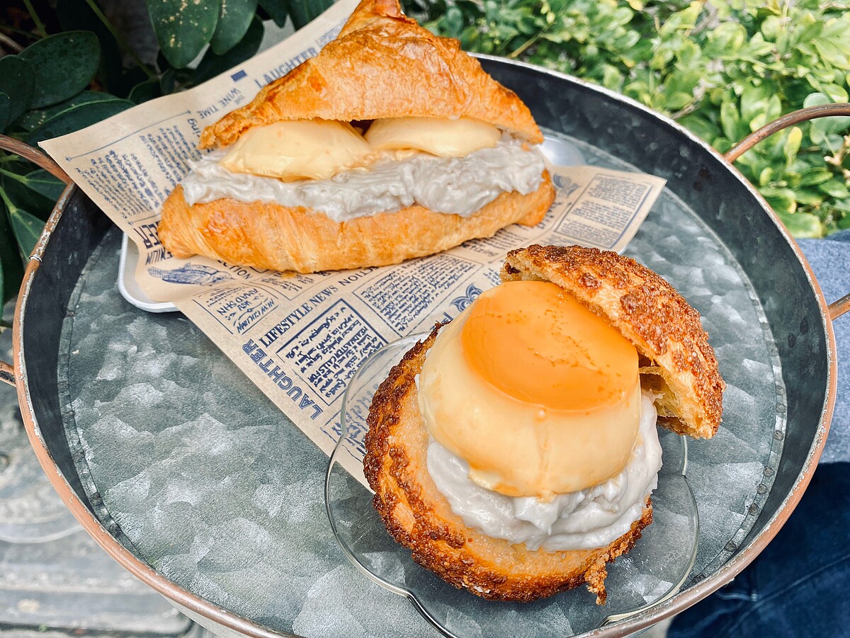 店內每天現烤可頌,一口咬下感受酥脆的外皮,內餡則是夾入了滿滿的手工芋泥及布丁,入口感受芋頭綿密卻還吃的到顆粒,再搭配柔軟的布丁口感,甜而不膩讓人忍不住一口接一口!