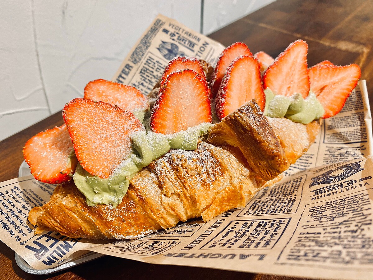 草莓季不能錯過~選用日本進口有機抹茶自製抹茶醬,搭配大湖新鮮草莓與現烤的可頌,滿滿的抹茶與草莓配上酥脆可頌就是下午茶的完美搭配!