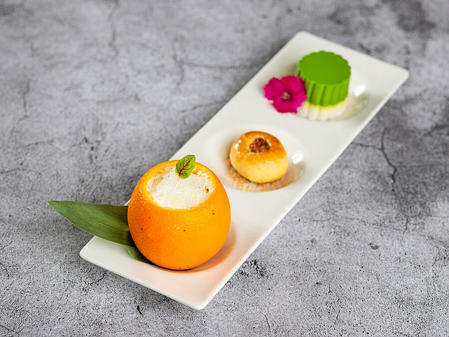 「泰國蝦頭油阿拉斯加蟹肉炒飯」將廣式炒飯加入用在泰式冬陰功湯中的蝦頭油及阿拉斯加蟹肉,每一口都能嚐到滿滿海味;工序繁複的「焗釀鮮蟹蓋」,是兼具濃郁奶香與蟹肉鮮甜的好滋味。「豉汁龍蝦蒸豆腐」在蒸籠上鋪上荷葉與巴西龍蝦,並用粵式料理的經典豉汁醬,提出龍蝦鮮甜,帶出多重鹹香口感。