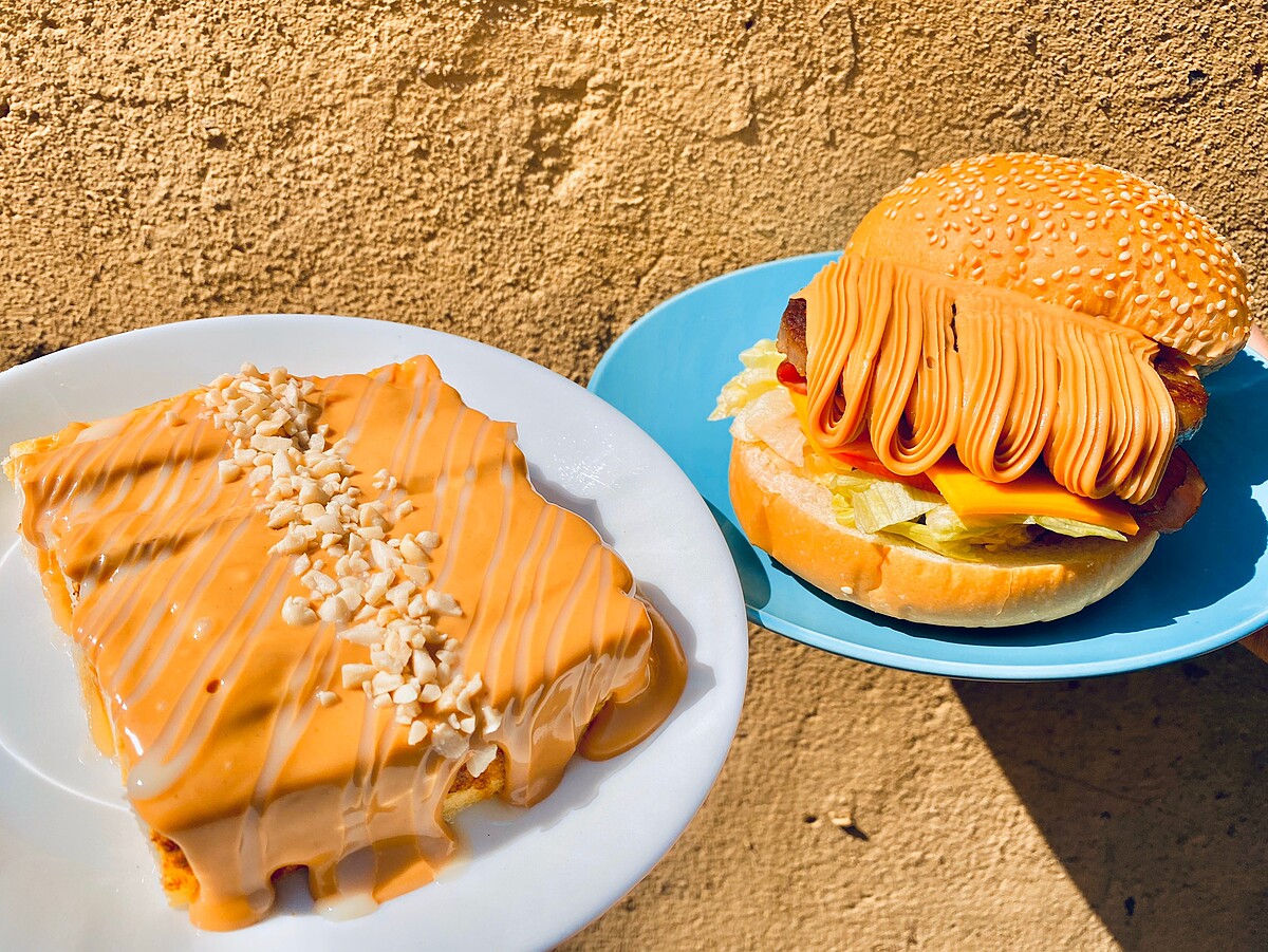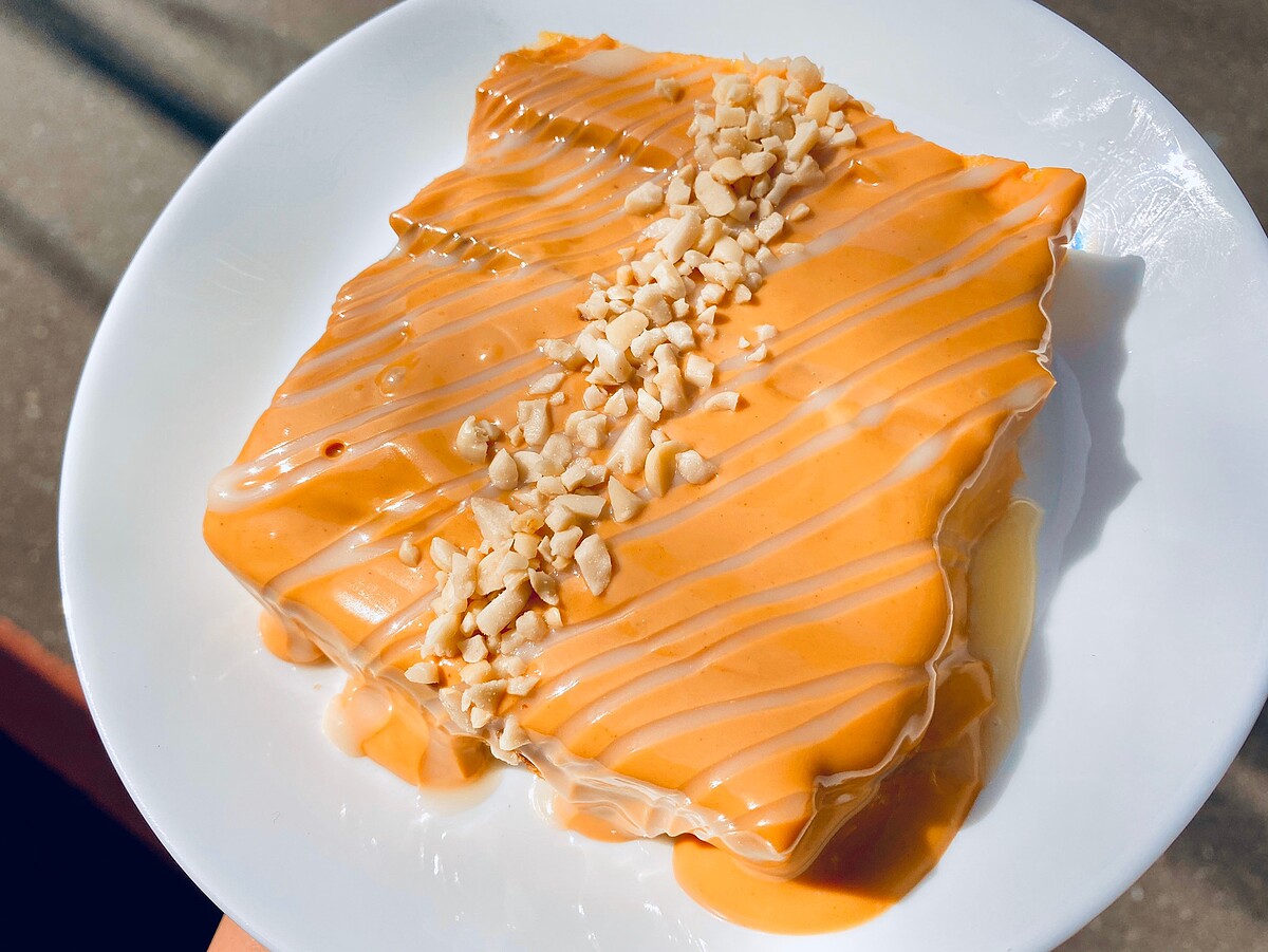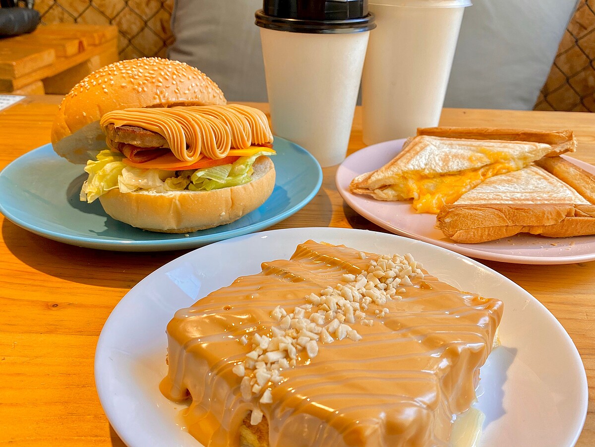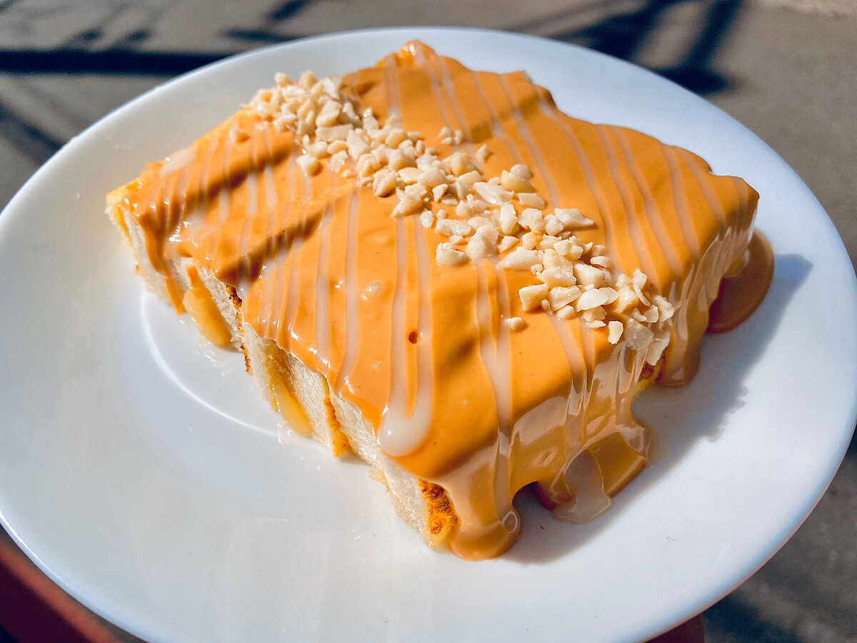 法式吐司中夾入乳酪絲,再淋上濃郁的花生醬,最後淋上香甜煉乳撒上花生角,品嚐起來不會過於甜膩~也可以搭配咖啡享用,開啟療癒的一天!