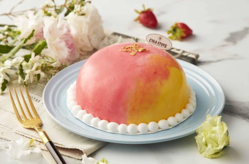 另一款還有「粉紅雲彩渲染冰淇淋蛋糕」(售價1080元),以2020年春夏PANTONE流行色火焰猩紅、番紅花黃為主調,打造三色漸層鏡面造型蛋糕,每顆均為師傅手工渲染,故如雲朵般的花色均為獨一無二款式,使用蔓越莓拌入草莓冰淇淋,搭配美國原裝進口的鹹甜的派皮餅乾,是女孩們最喜歡的酸甜滋味。