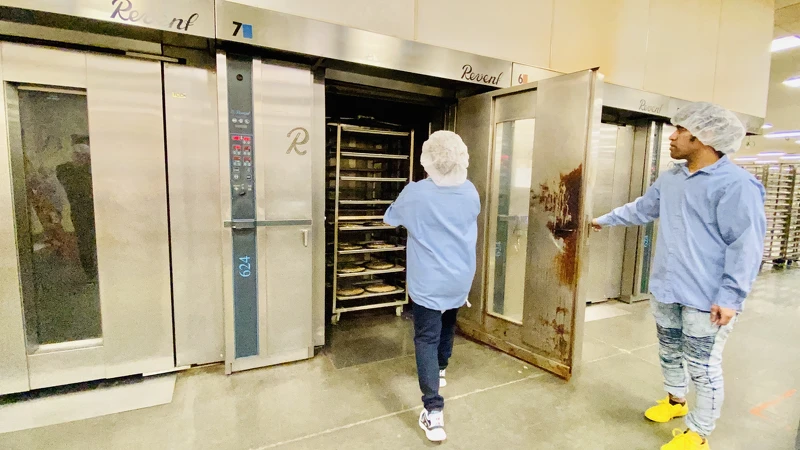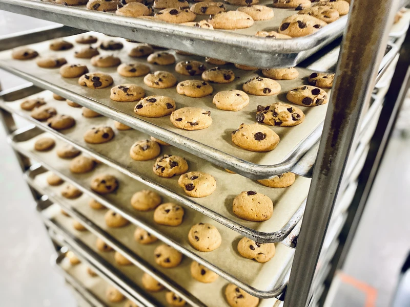生產過程的起點從烤餅乾開始,將一片片的餅乾放上烤盤,剛出爐的餅乾濕濕軟軟的,香味逼人讓人難以抗拒!