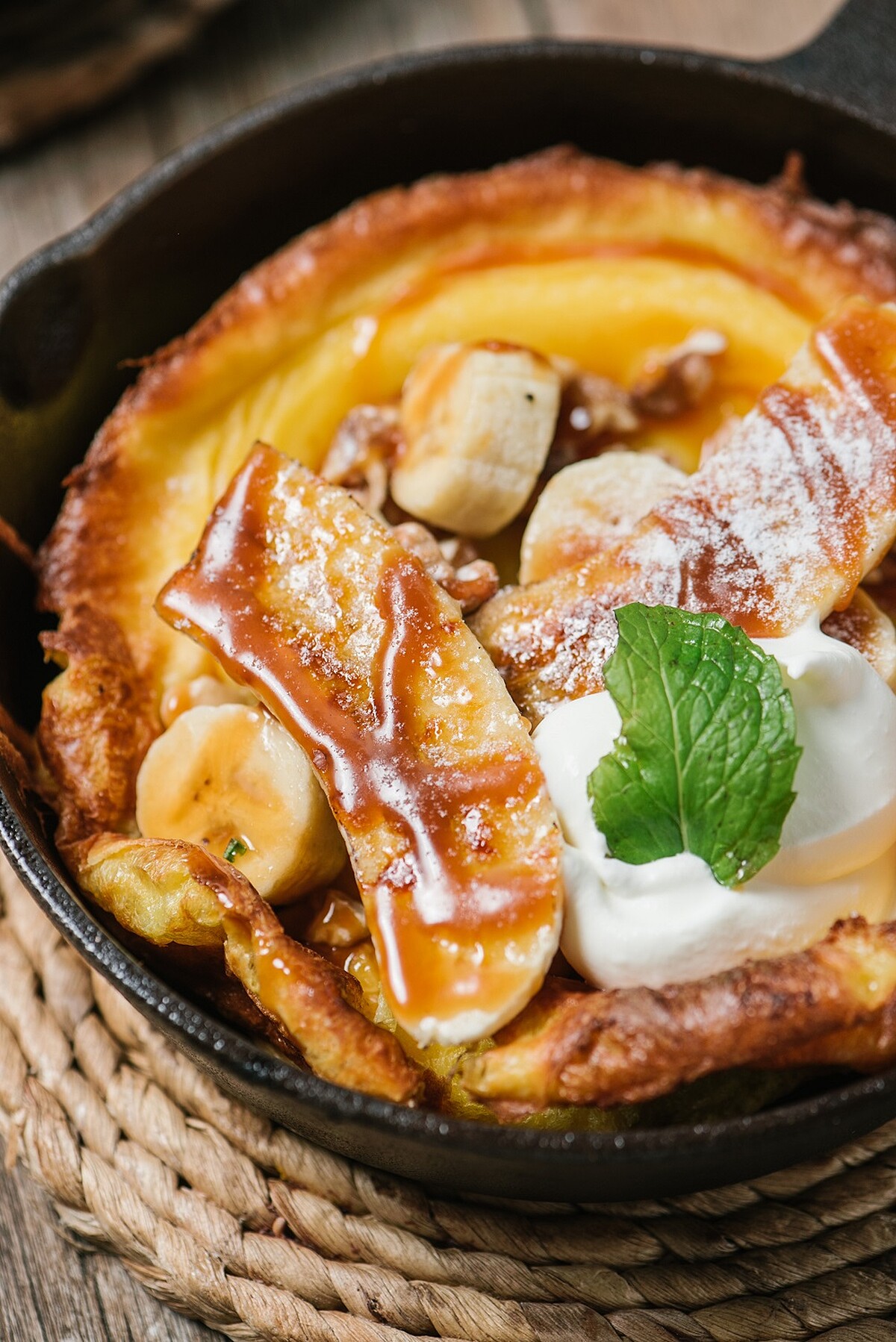 從P&T柏林茶館的家鄉德國出發,俗稱「荷蘭寶貝Dutch Baby」的鐵鍋鬆餅。本季新推出焦糖核桃香蕉口味,以費心熬煮的焦糖核桃醬搭配台灣最具代表性的香蕉,充份以在地的味道呼應德國點心。