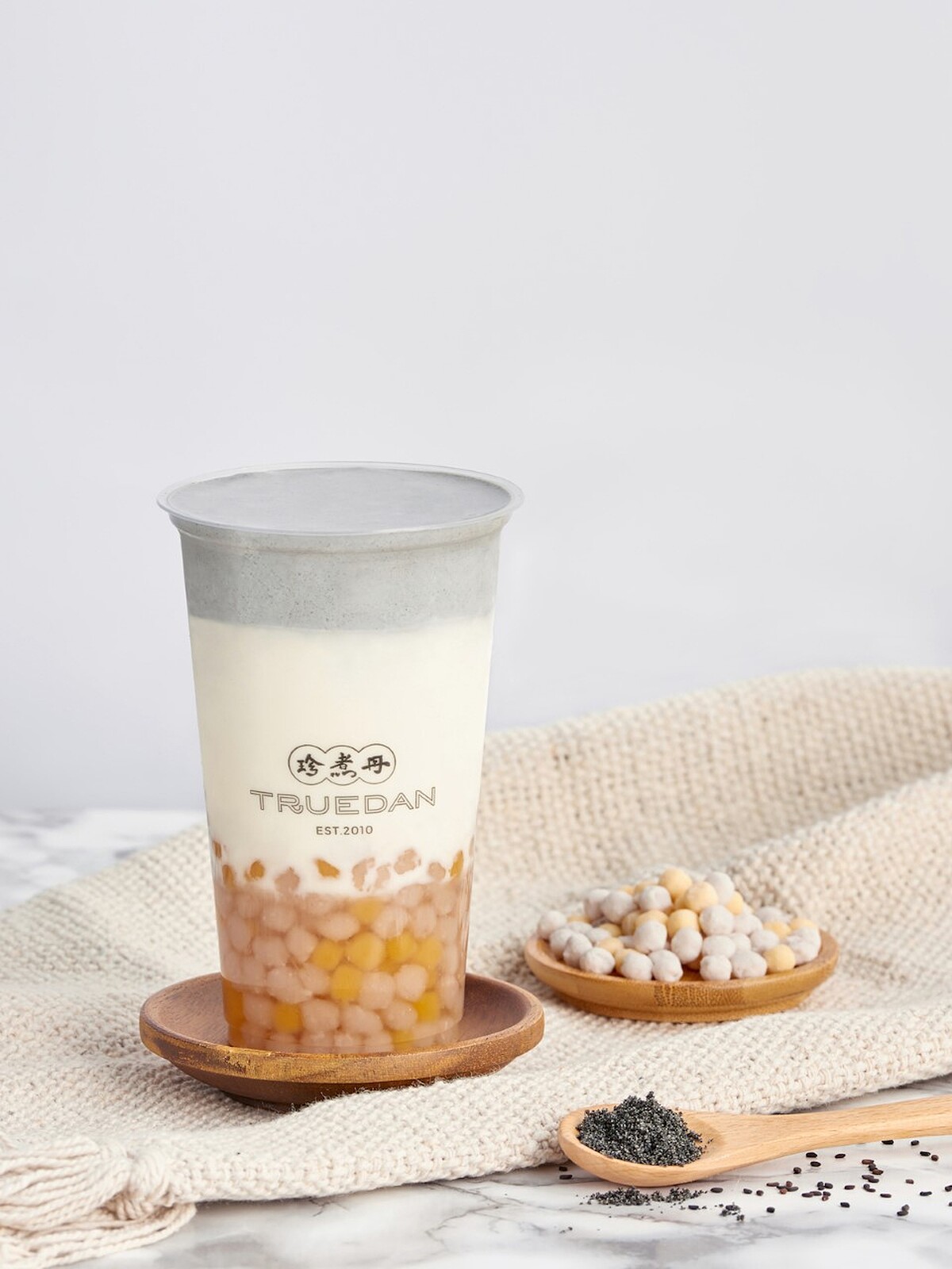 另一款「茉香圓圓」則是選用風味淡雅的茉莉花茶及鮮奶為基底,結合雙色小芋圓,最後抹上綿密芝麻香緹,完全是芝麻控的夢幻之選。