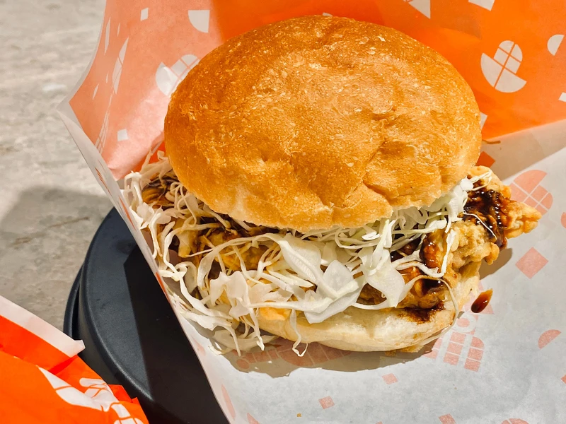 現炸茴香雞腿肉與大量現切高麗菜絲,炸腿肉淋上陳醋醬、高麗菜絲搭配香濃塔塔醬,酸中帶甜、多重口感風味堆疊讓人一吃就愛上!