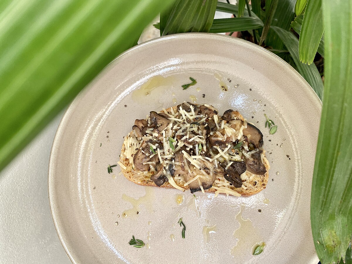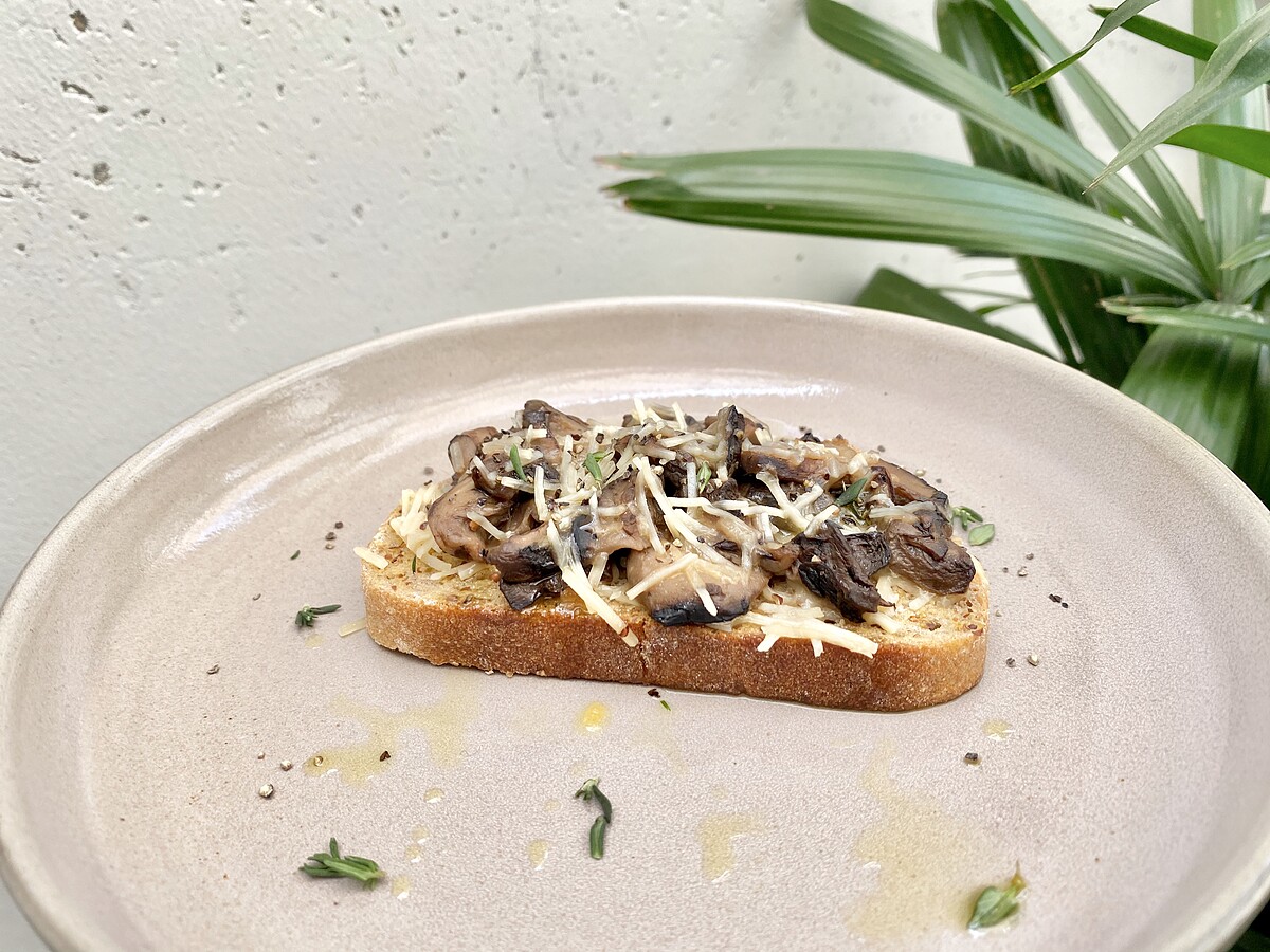 選用偏中性的酸麵包,搭配鮮炒洋菇及香菇、再灑上雙層帕瑪森乳酪與香料點綴~鹹香滋味上人一吃就上癮!