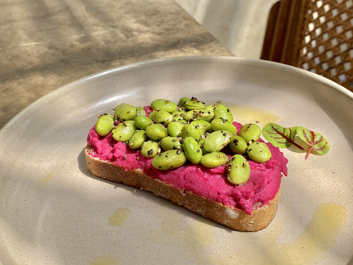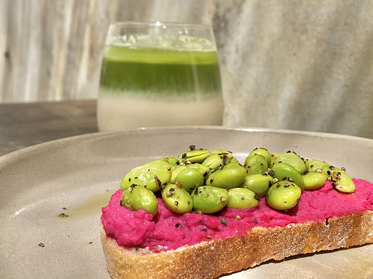 將甜菜根、鷹嘴豆與其他香料製作而成鮮豔的甜菜根醬,最後再鋪上毛豆~適合喜愛清爽風味、怕胖的人享用!