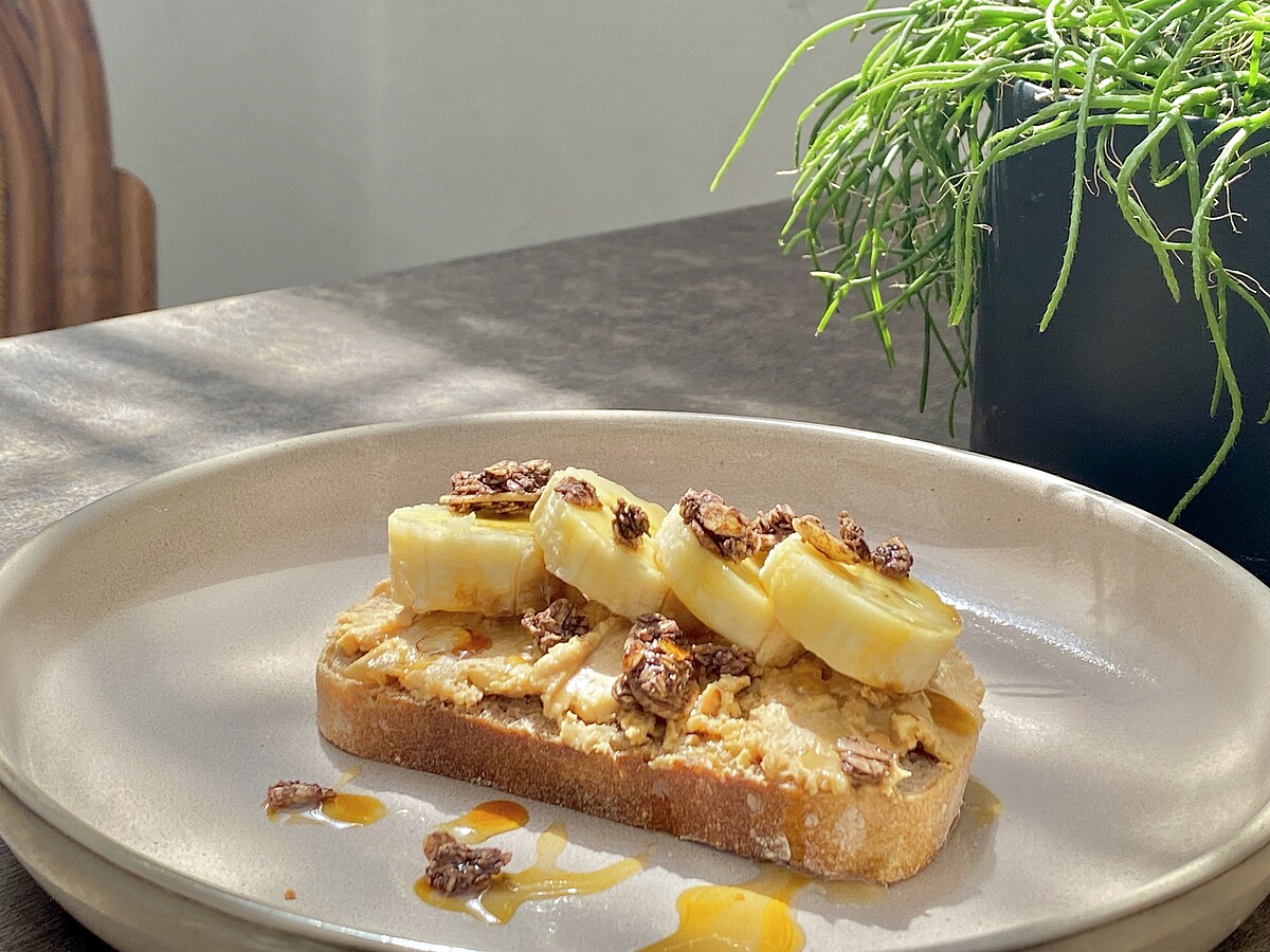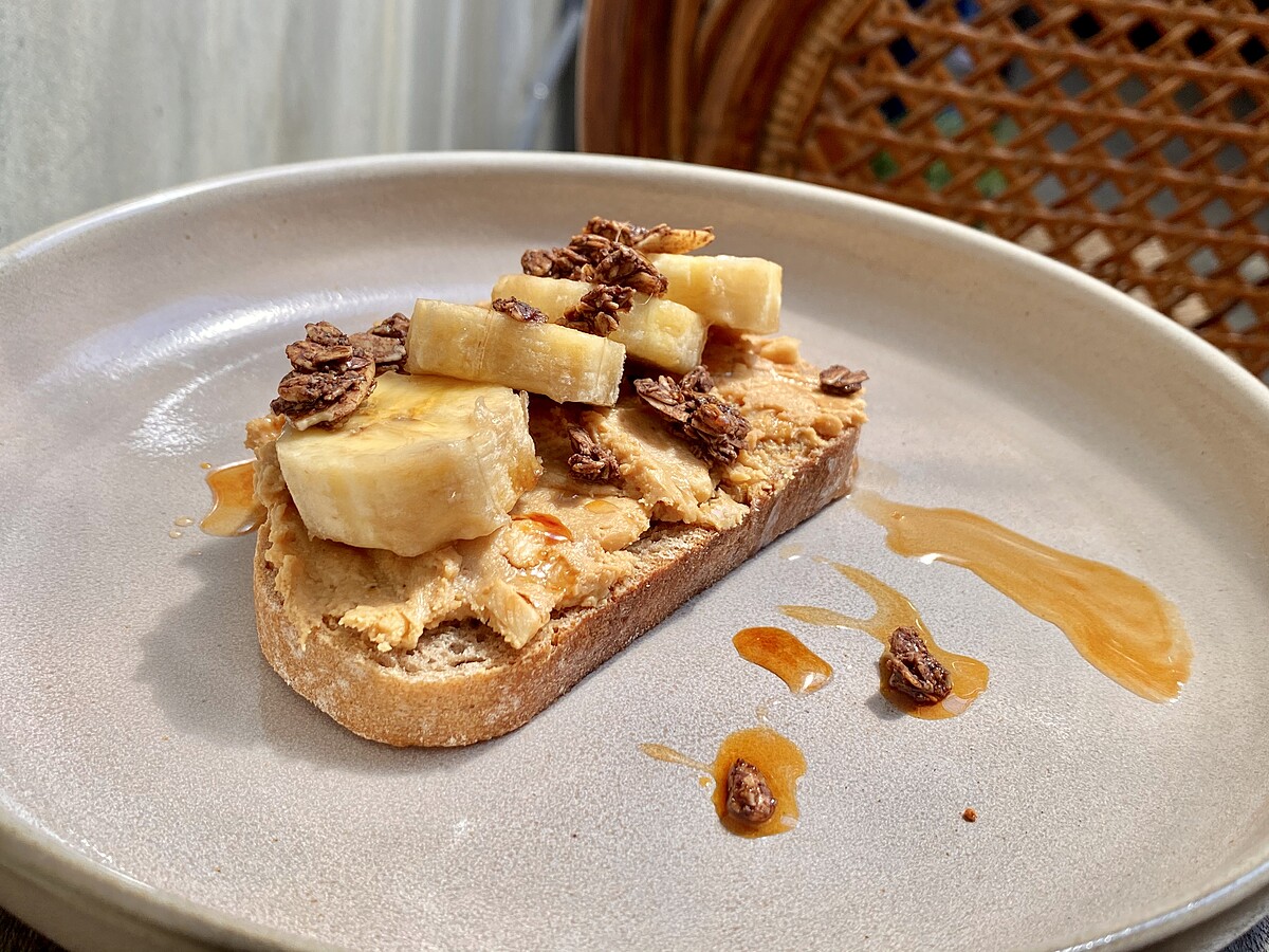 除了鹹點外~喜愛吃甜食的人也可以選擇香蕉濃花生三明治,誘人的花生醬撲滿吐司再放上香蕉、最後再撒上堅果更增添口感。搭配一杯咖啡就是最完美的下午茶!