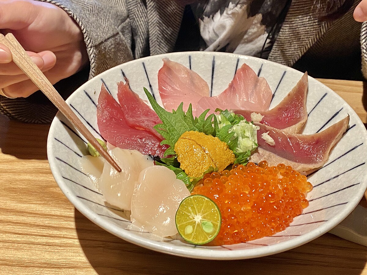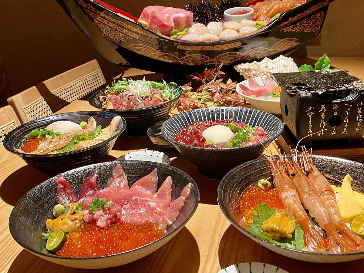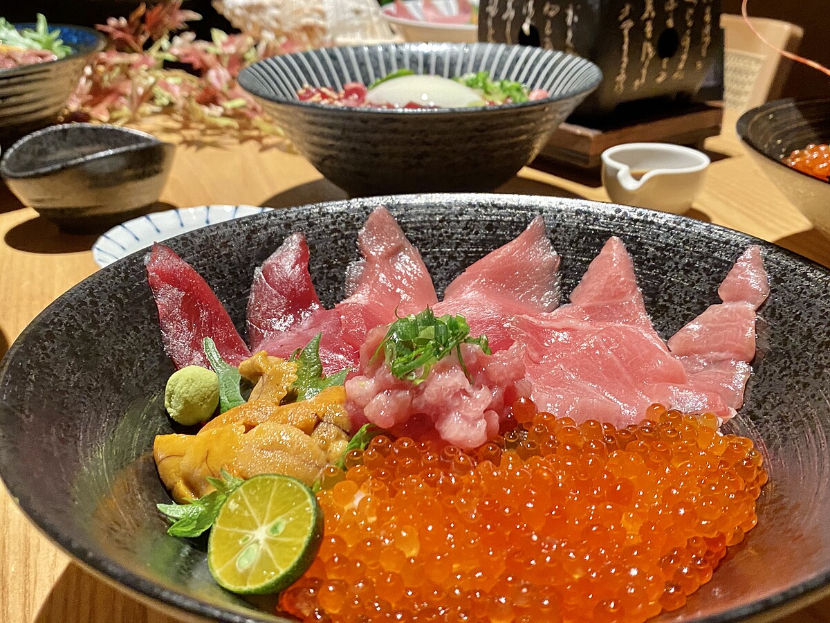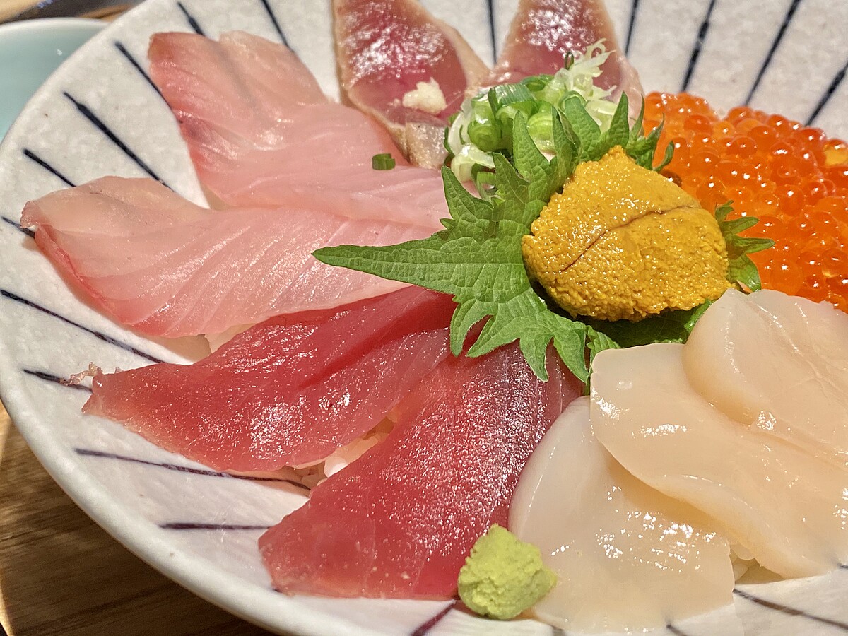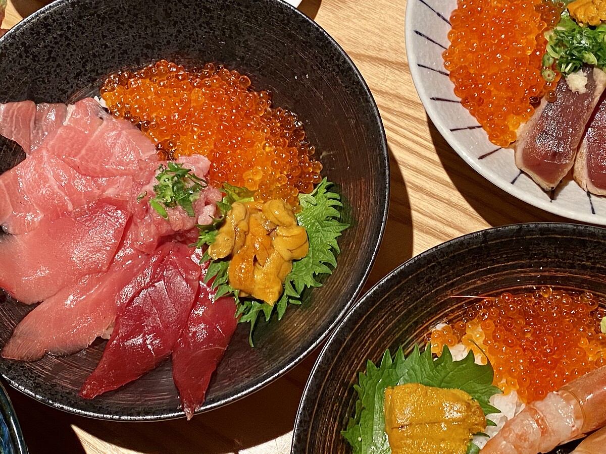 適合有選擇困難症人享用,一次品嚐到各種頂級海味!「時令鮮魚海鮮丼」厚切每日捕獲的時令鮮魚、鮪魚及炙燒鮪魚,再搭配生食級干貝、魚卵、海膽等豐富海味!