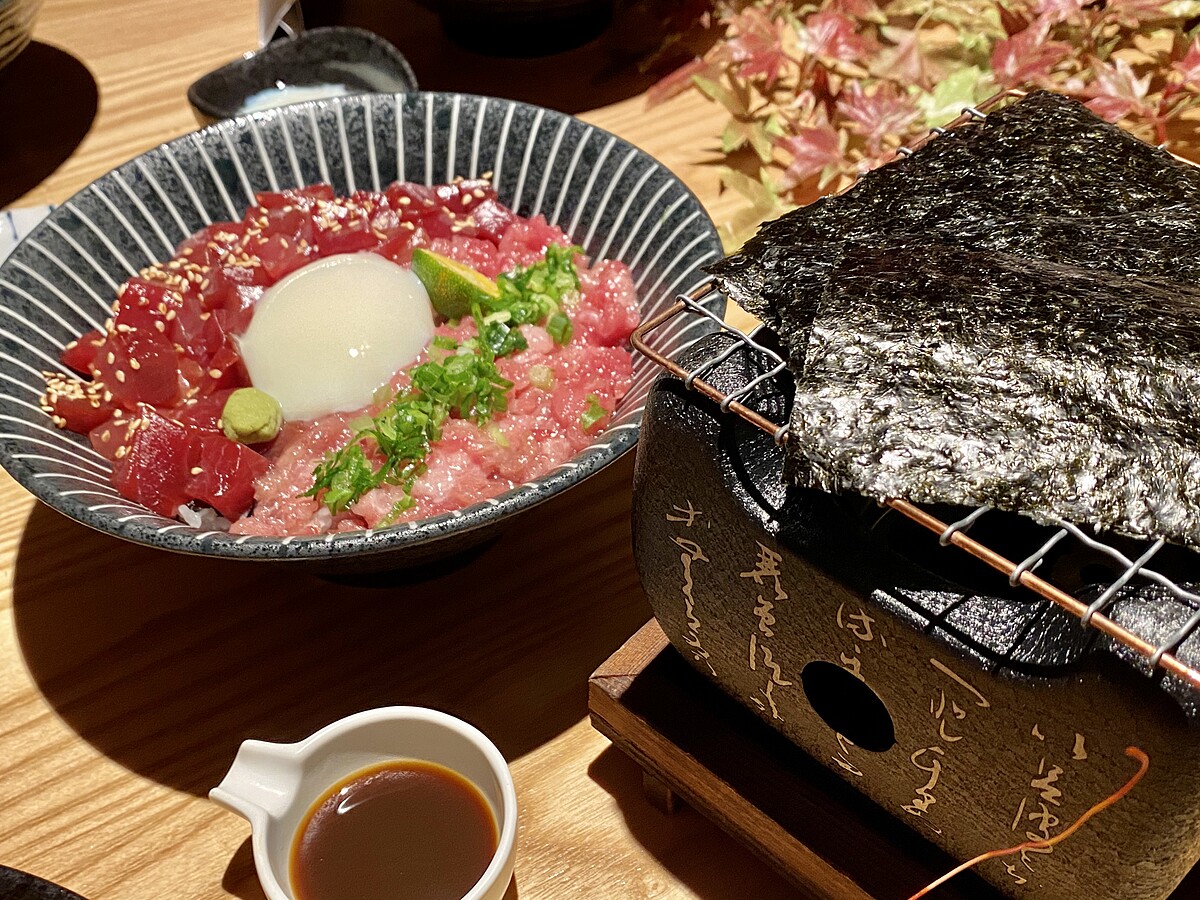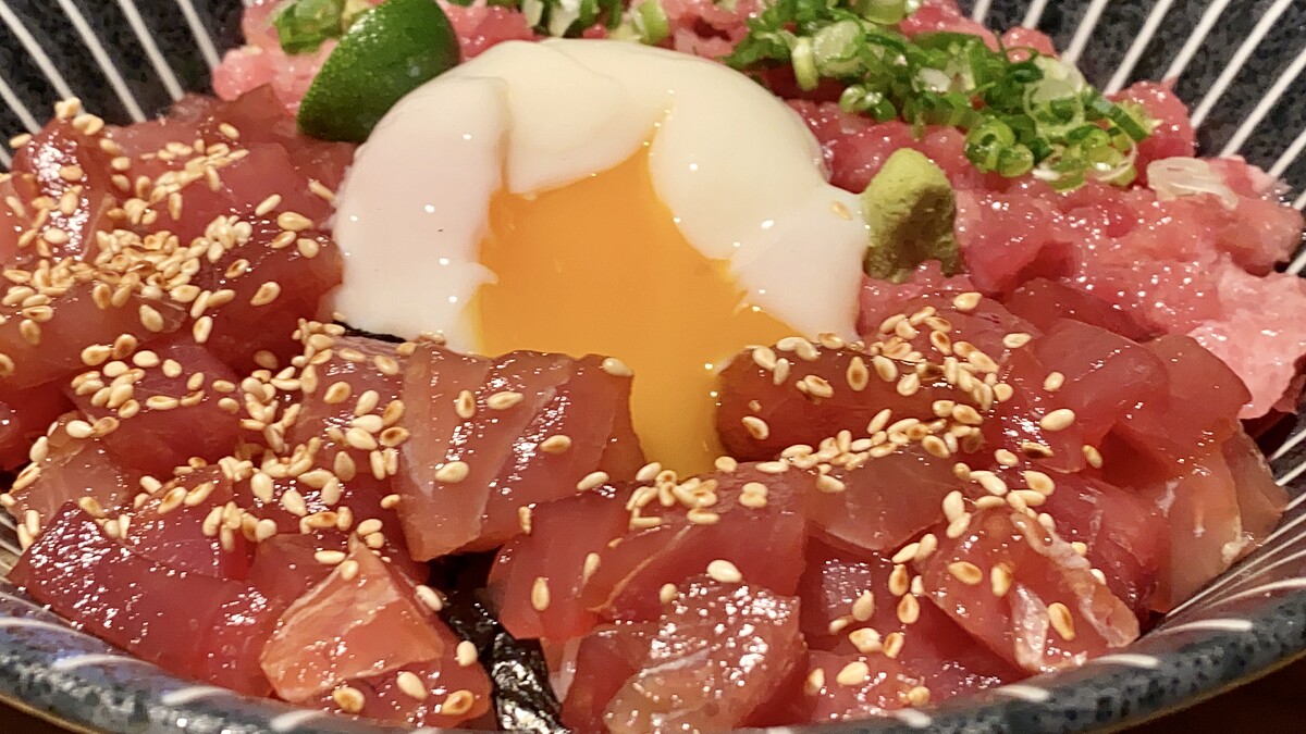 講究兩重式吃法,採用頂級黑鮪魚剁碎成泥後,再搭配社長特調醬汁醃漬的黃鰭鮪丁及半熟玉子,除了感受鮪魚丁Q彈及黑鮪泥的濃郁滑順~