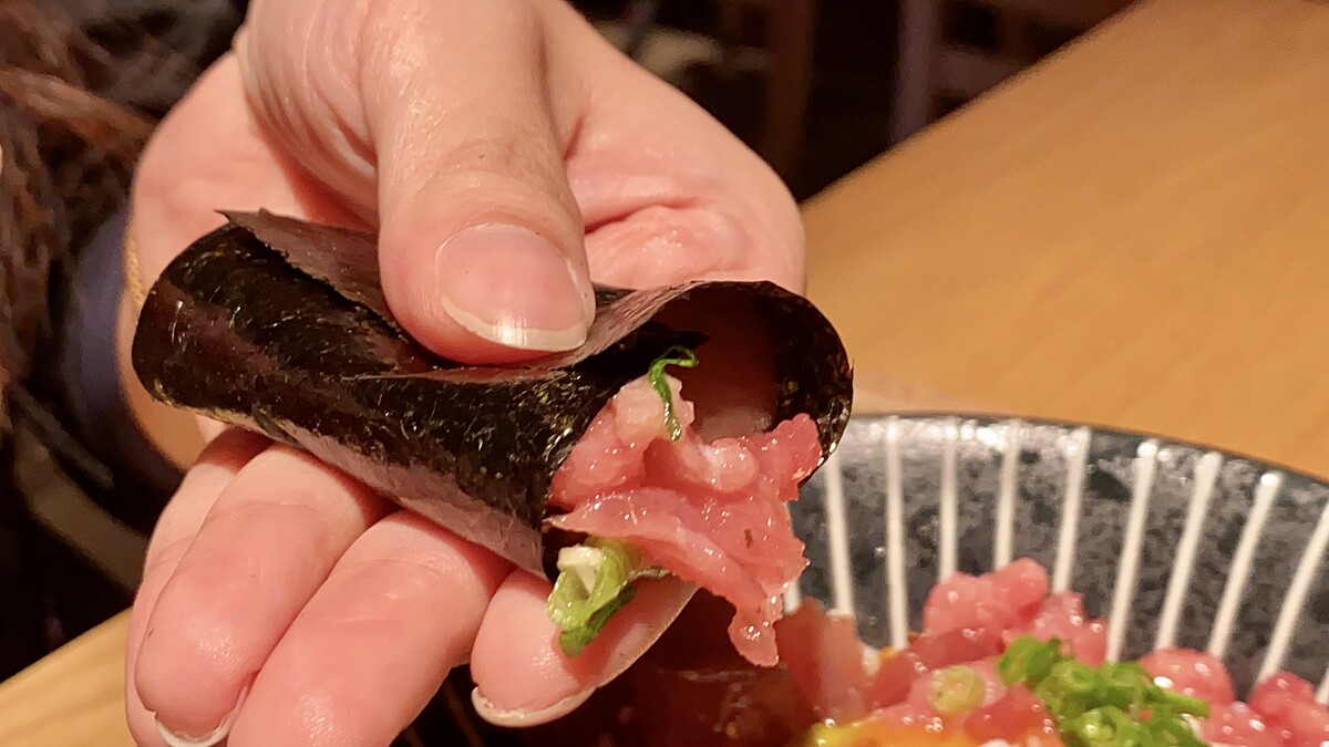 另外為了增添口感及香氣,日本社長更設計搭配炭爐,並附上九州特選海苔,以爐火炭烤海苔至散發微焦香後,以香脆海苔包裹黑鮪泥及些許醋飯食用,更具多層次的爽脆風味。