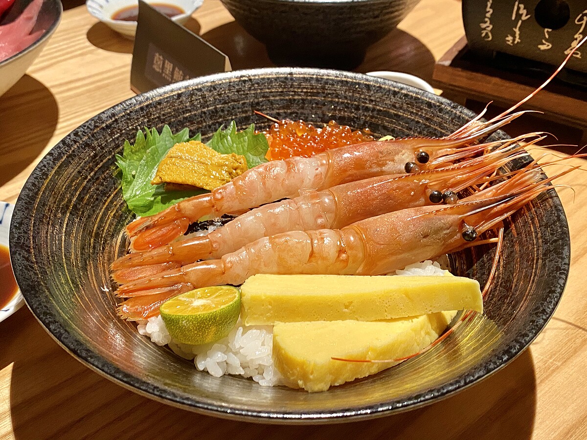 放上三尾碩大的生食級鮮甜牡丹蝦,搭配滿滿海膽與魚卵,蝦肉飽滿份量十足,擠上一些金桔汁更能帶出鮮甜風味,搭配味鮮彈牙的魚卵,以及濃郁綿密的海膽,三種極鮮風味完美結合,視覺也更加升級!