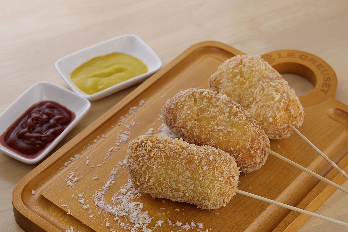 有別於一般販售的炸熱狗裹麵糊的製作方式,將麵糰直接包裹在熱狗上,再沾取蛋液、麵衣炸至金黃酥脆,在圓圓胖胖的外皮下,外表帶酥脆、咬下後同時感受扎實鬆軟之間的口感,職人建議品嚐時採以日式熱狗的正統吃法,一定要同時淋上微嗆辣黃芥末與酸甜番茄醬,兩者搭配之下才能突顯出具有甜度的「胖Pan熱狗」獨特美味。