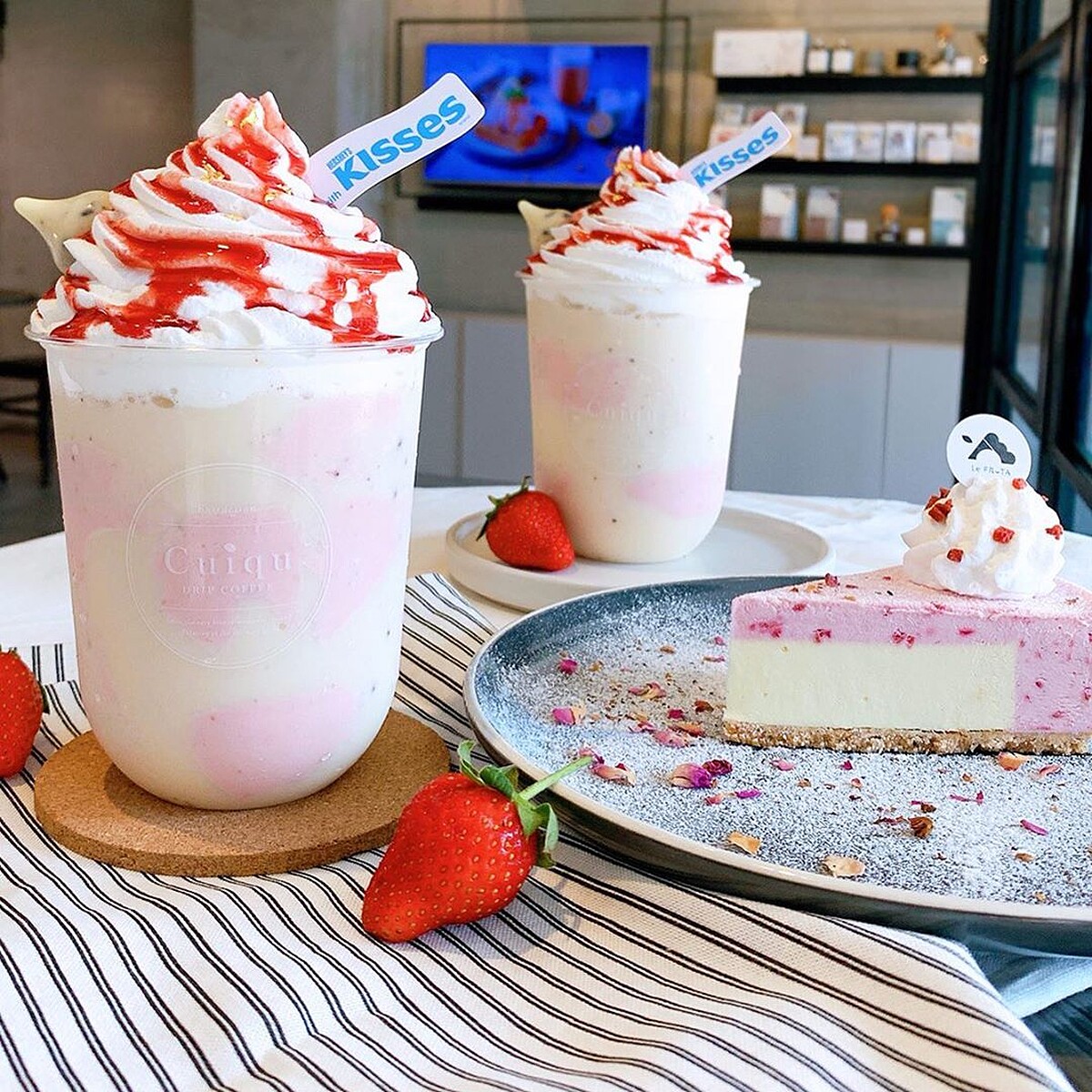 巧克力控必喝~Cuiqu Coffee 奎克咖啡與KISSES好時巧克力推出草莓巧克力冰沙,店面以寬敞明亮文青的設計成為IG人氣打卡美食,從蛋糕甜點到早午餐鹹食通通有!