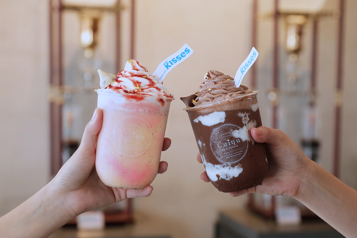 近期與KISSES好時巧克力聯名推出2款期間限定飲品法式熱吻-醇濃可可冰沙、輕甜初吻-草莓巧酥冰沙,濃郁巧克力滋味不能錯過!