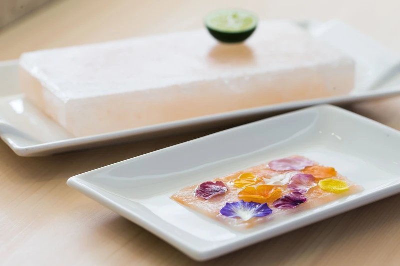 以日本牡丹蝦為食材,用義大利傳統手法拍打成義式薄切;食用時,將蝦肉及用蝦汁製作而成的冰淇淋混在一起享用。日本食用花作為擺飾,整道料理像花園般華麗。