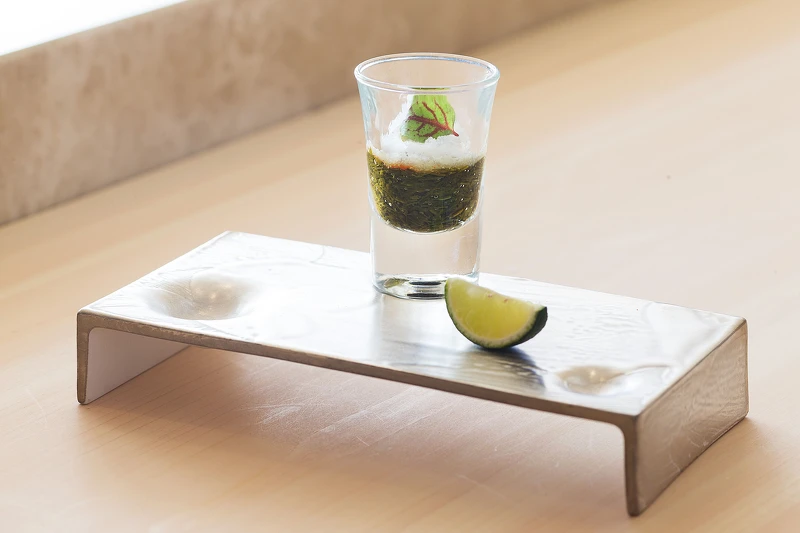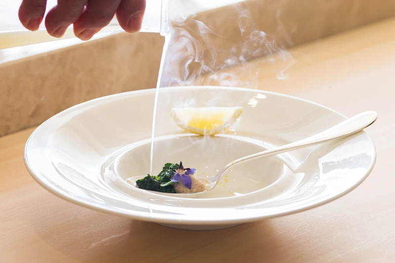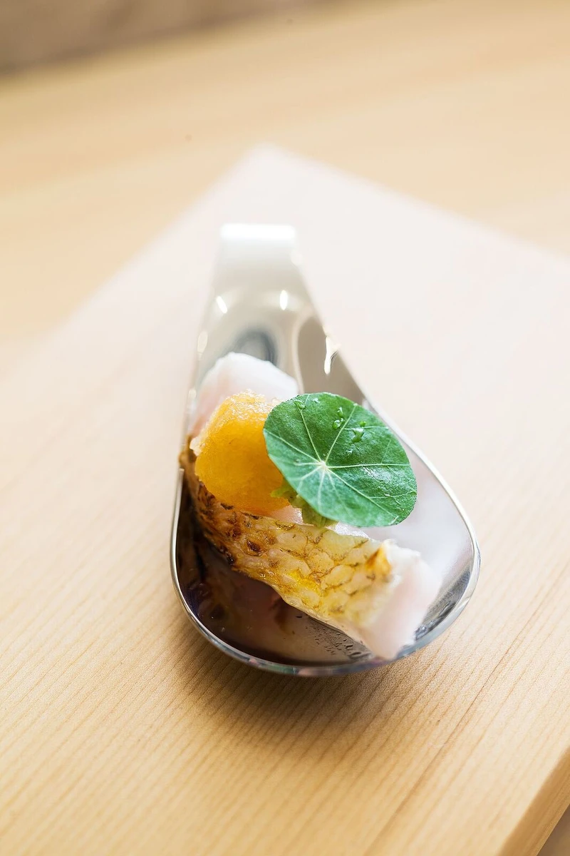 將用鰆魚、稻草及日本備長炭柴燒至半熟,灑上海鹽,用日本牛蒡配以鮮奶油製成的醬汁,簡單地保留了魚的新鮮口味。