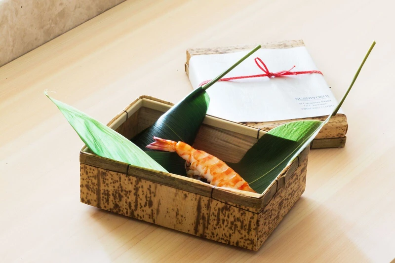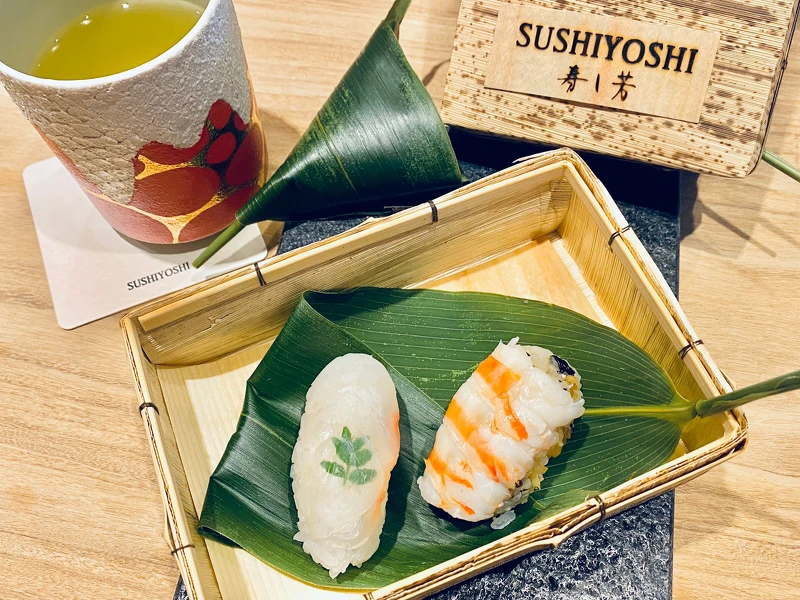 日本新鮮空運竹葉包裹,用大阪傳統白醋飯,飯裏面加了干瓢、冬菇、薑、花竹蝦,讓壽司充滿了竹葉香氣。