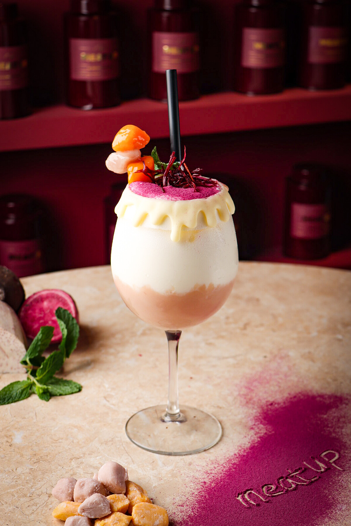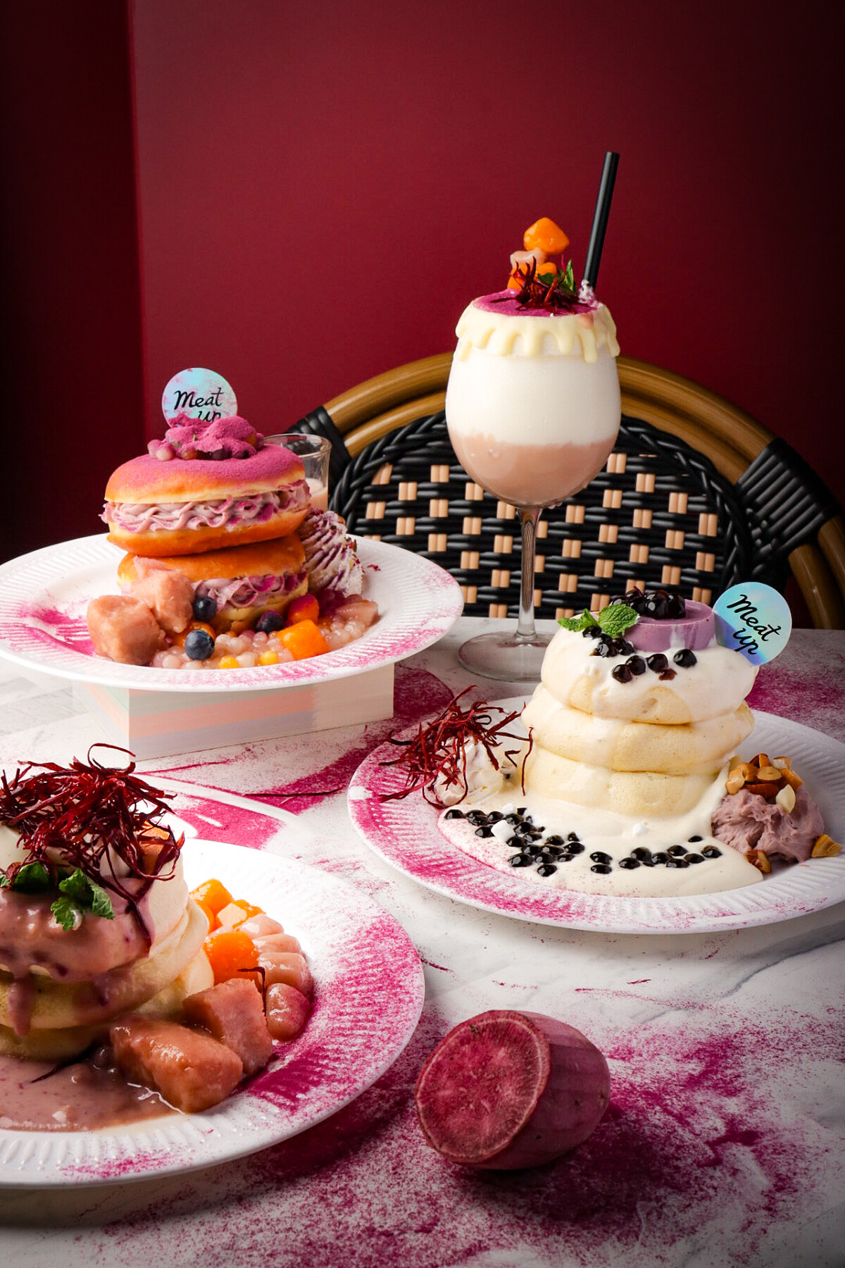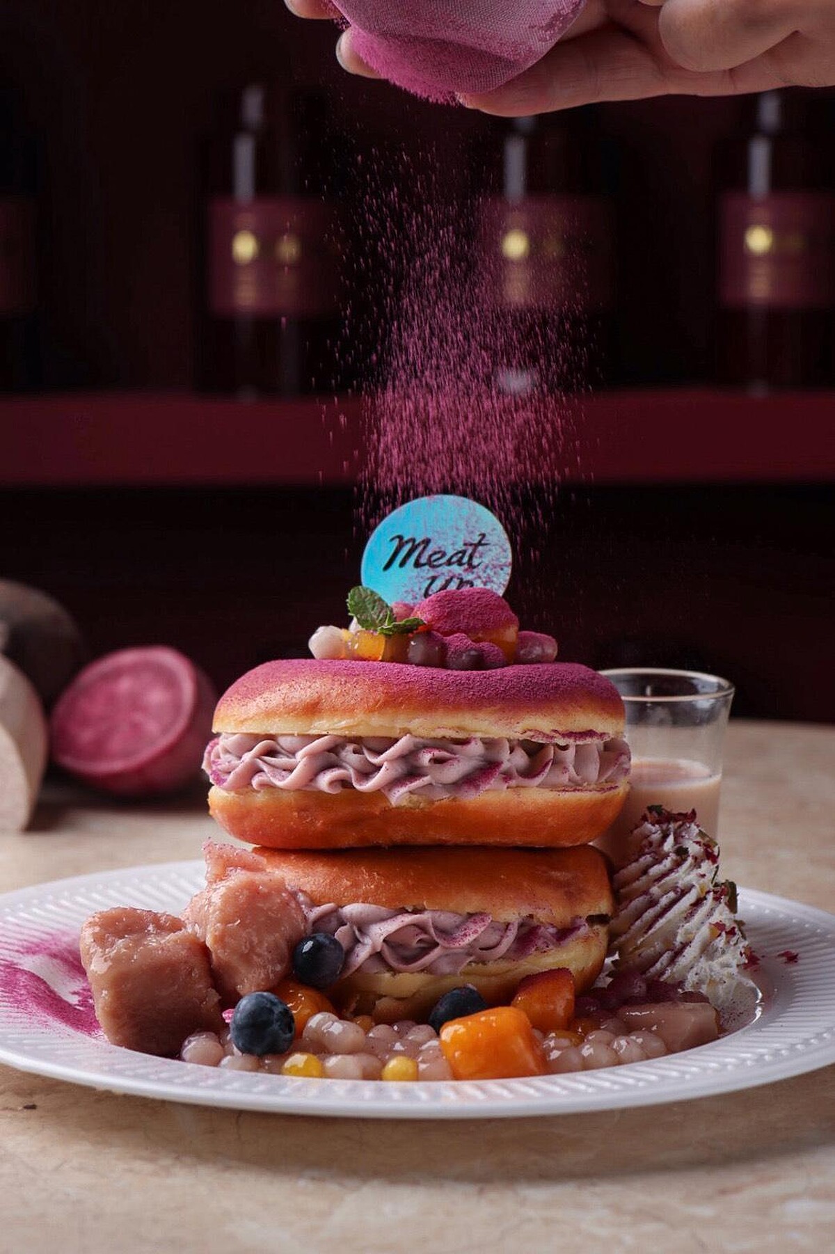 MEAT UP在這一次的芋泥季,推出芋泥搭配鹹甜奶蓋、黑糖珍珠的口味,另外還有一款外觀看似平凡,一刀劃開會爆出金黃內餡的金沙芋泥舒芙蕾,芋泥的香甜交織金沙的鹹香,兩者顆粒在口中交疊,口感層次豐富讓人嘴饞上癮!