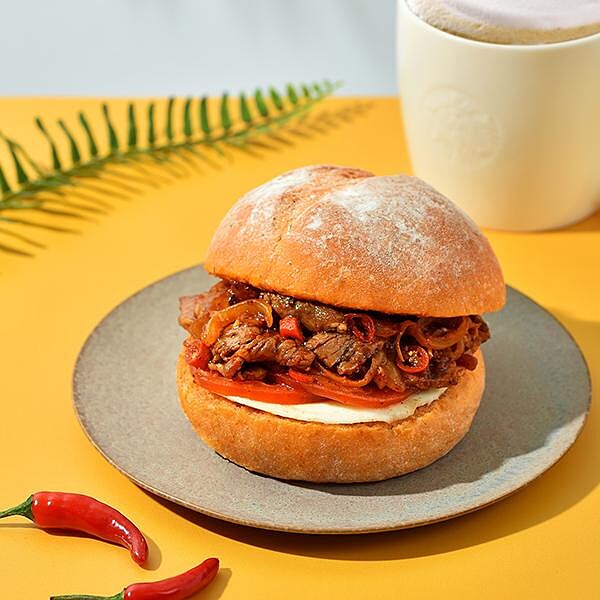 揉以清甜番茄麵包,搭配微辣洋蔥豬肉片、牛番茄片及清爽嫩口的蛋白薄片是款舒服的鹹食。