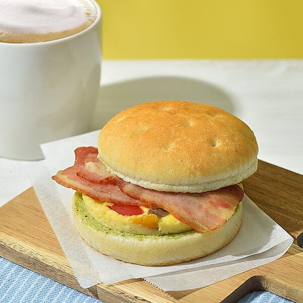 以義大利原裝進口專用粉製作的佛卡夏,抹上青醬增添風味,內餡搭配經典的培根、西班牙風蔬菜烘蛋,增添清新早晨氣息與風味。