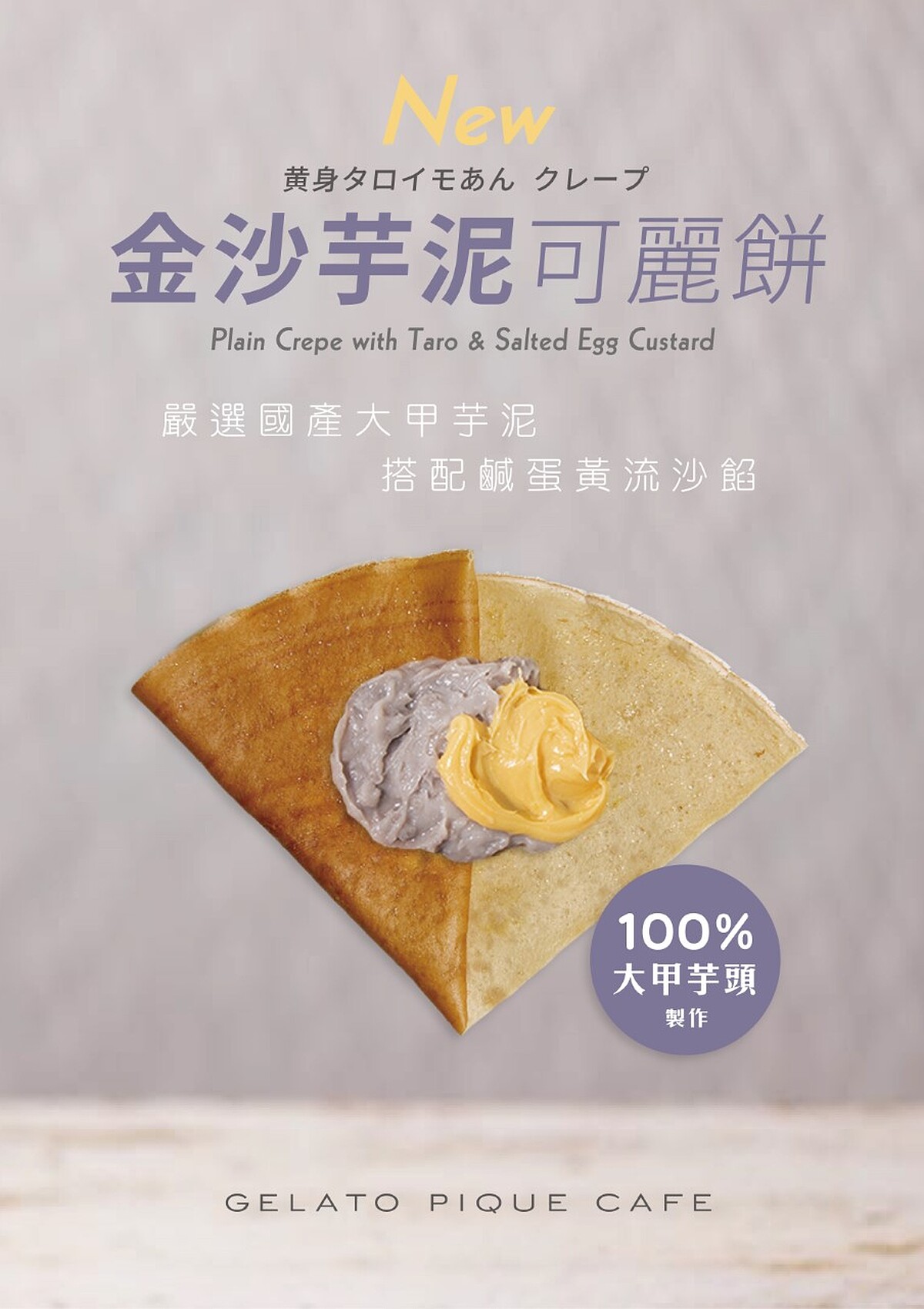 「金沙芋泥可麗餅」採用職人嚴選的台中大甲新鮮芋頭與頂級鹹蛋黃流沙餡,搭配法國ECHIRE發酵奶油及小麥粉所製作而成的可麗餅皮,除了奶油香氣,入口後濃郁的芋泥與鹹蛋黃流沙餡交織,營造出絕妙的鹹甜滋味。