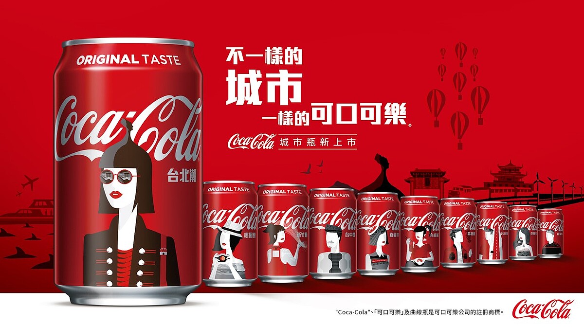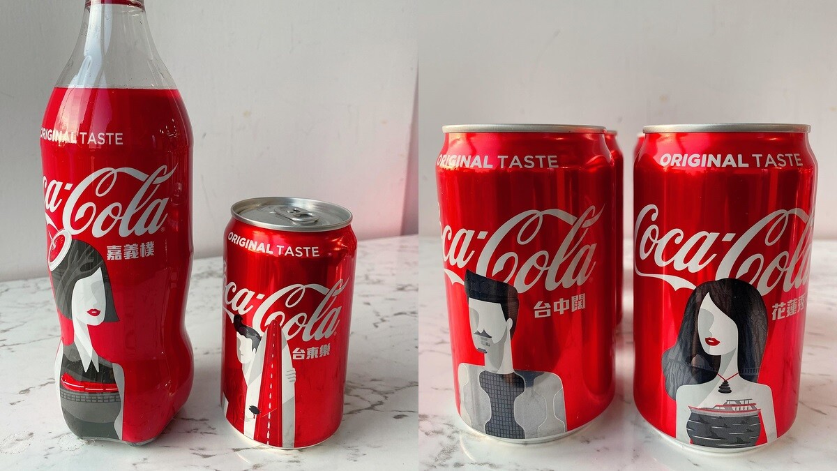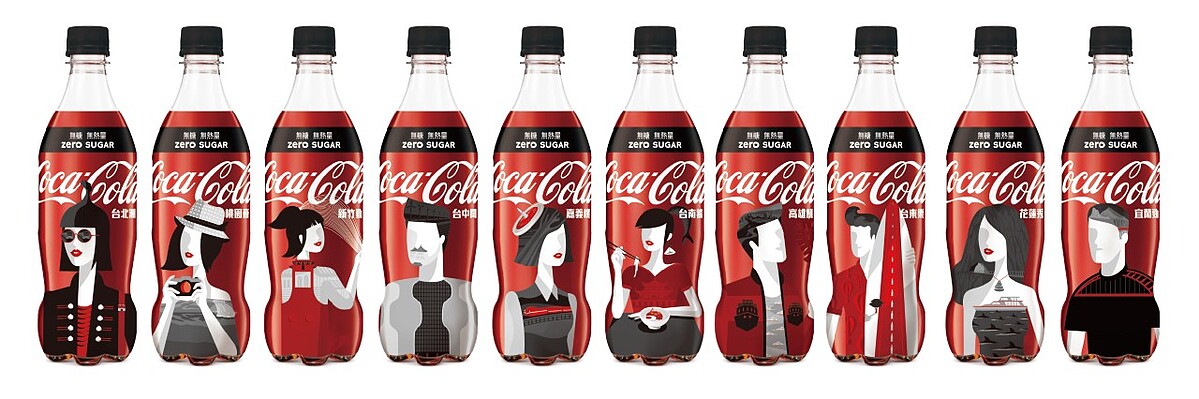 可口可樂首度推出的10款台灣城市瓶,與著名平面設計師Noma Bar合作,包括台北、桃園、新竹、台中、嘉義、台南、高雄、宜蘭、花蓮以及台東,其中像是台北瓶以「潮」字展現其特性,瓶身融合了名聞海內外的著名小吃小籠包、名景女王頭、北門以及名聞遐邇的台北捷運。