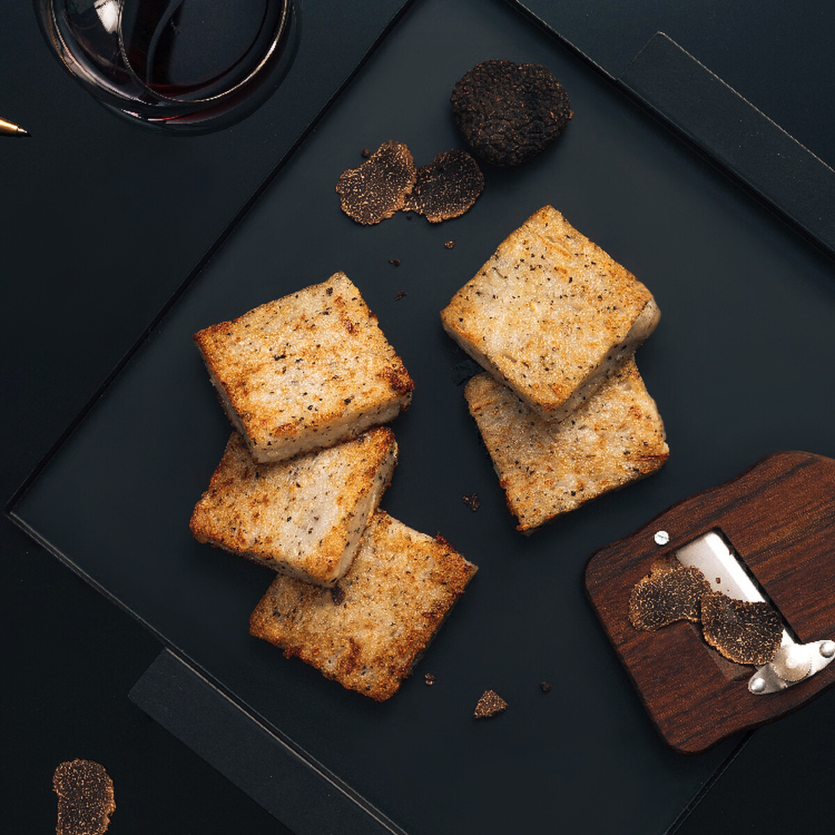 另一款「黑潮蘿蔔糕」添加頂級黑松露,顛覆黑松露給人難以在中國菜入菜的印象,在黑松露和蘿蔔糕之間找到味蕾的完美平衡,黑松露的重香搭上白蘿蔔的清甜,香氣四溢的黑松露,入口感受黑松露與蘿蔔絲的層次交疊,香氣濃郁喜愛黑松露的人必吃!
