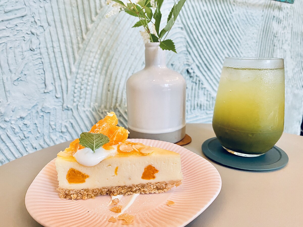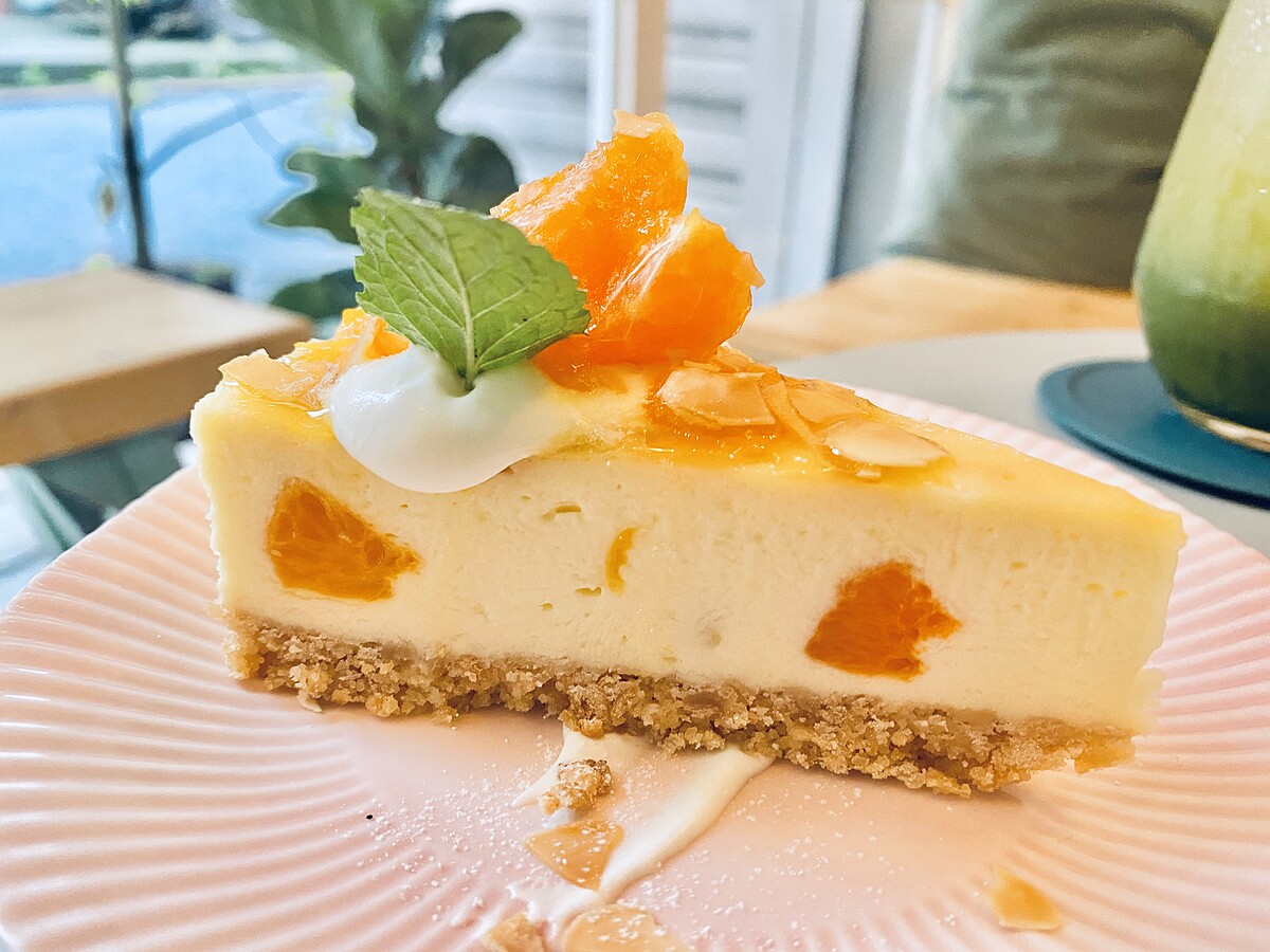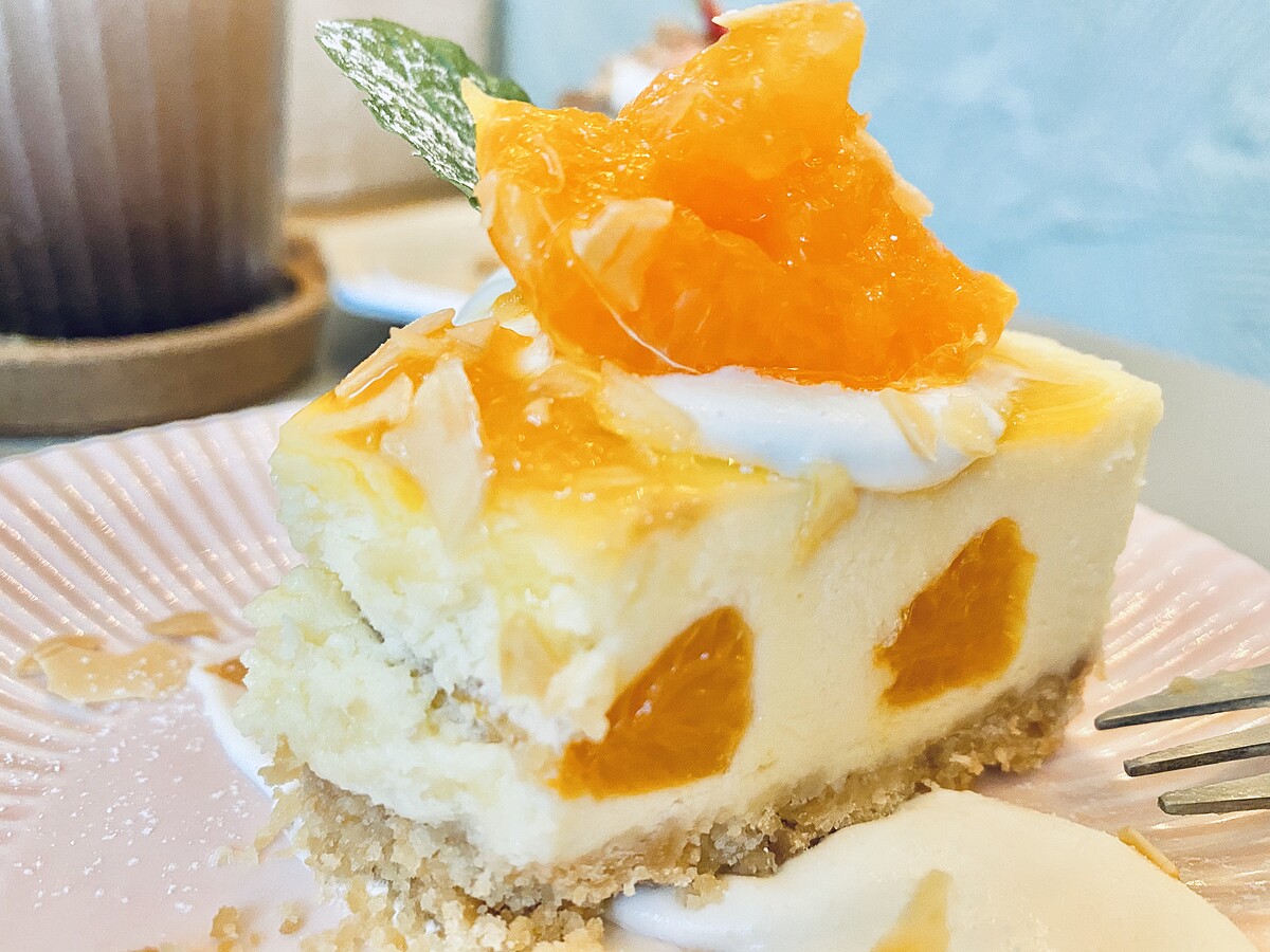 最上方在加入新鮮茂谷柑果肉,並淋上自製的橘子果醬,一口吃下酸甜適中,橘子的香氣、酸度讓重乳酪蛋糕吃起來完全不會膩口反而更加清爽!