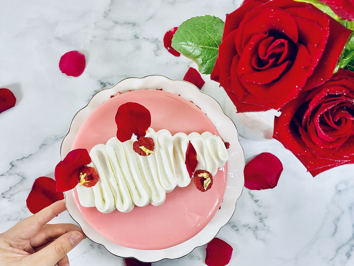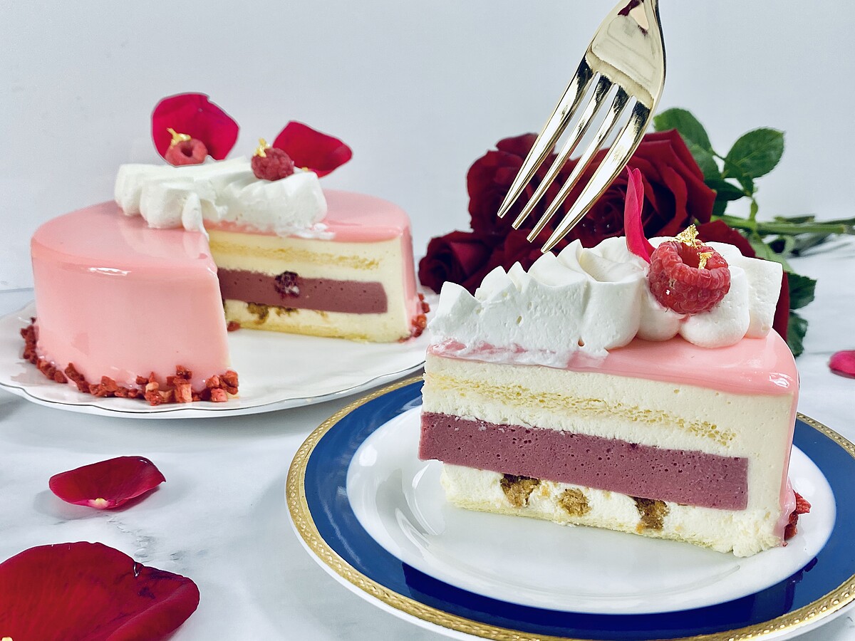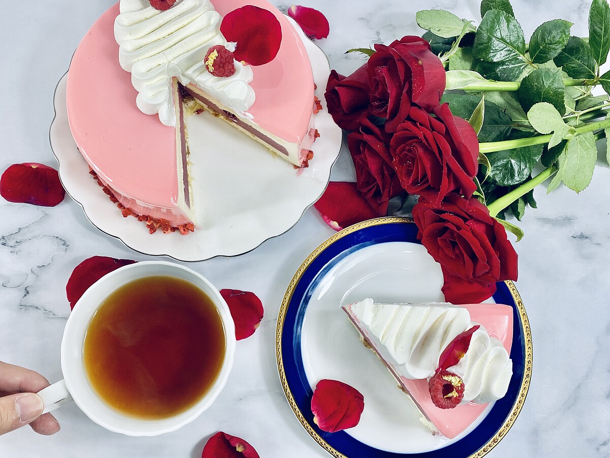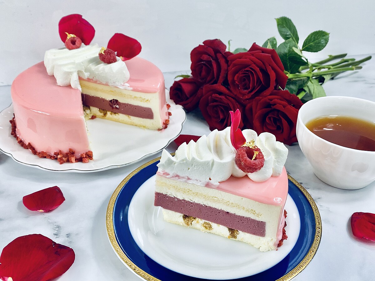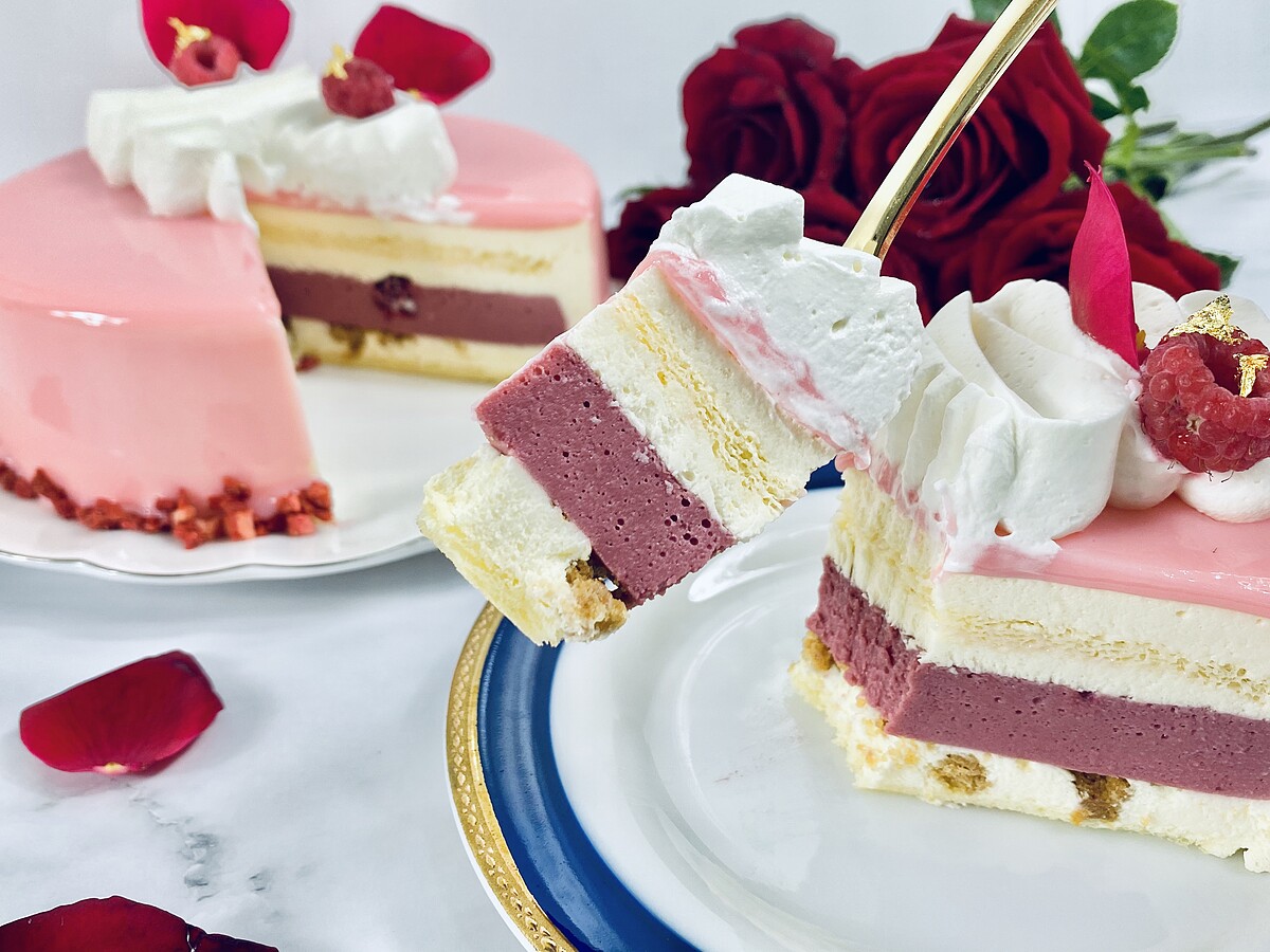 以原味戚風蛋糕為基底,在加入起士慕斯、覆盆子庫利,再搭配莓果、食用玫瑰、金箔點綴,看起來更加奢華典雅!