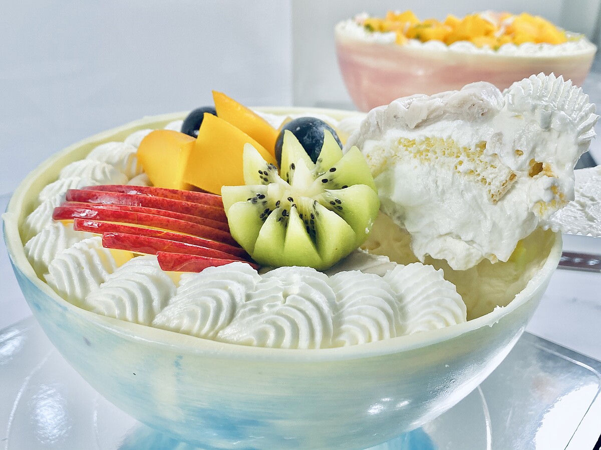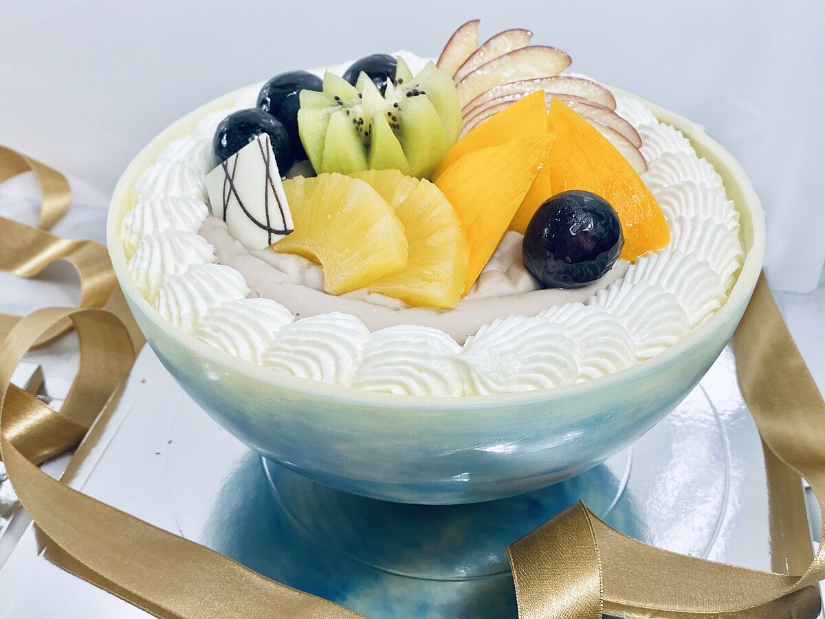 這款藍色質感滿分~不想敲破的人也可以選擇直接將上方的巧克力拿起來,上面佈滿了當季新鮮水果裝飾!