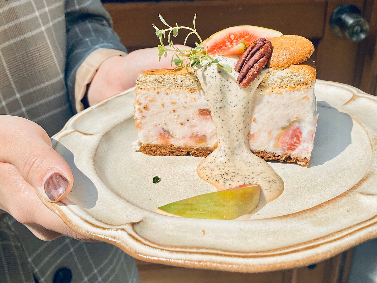 在起司蛋糕中加入無花果汁、可爾必思品嚐起來風味更加清爽,底部的餅乾與最上層的伯爵茶蛋糕增添多層次的豐富口感!