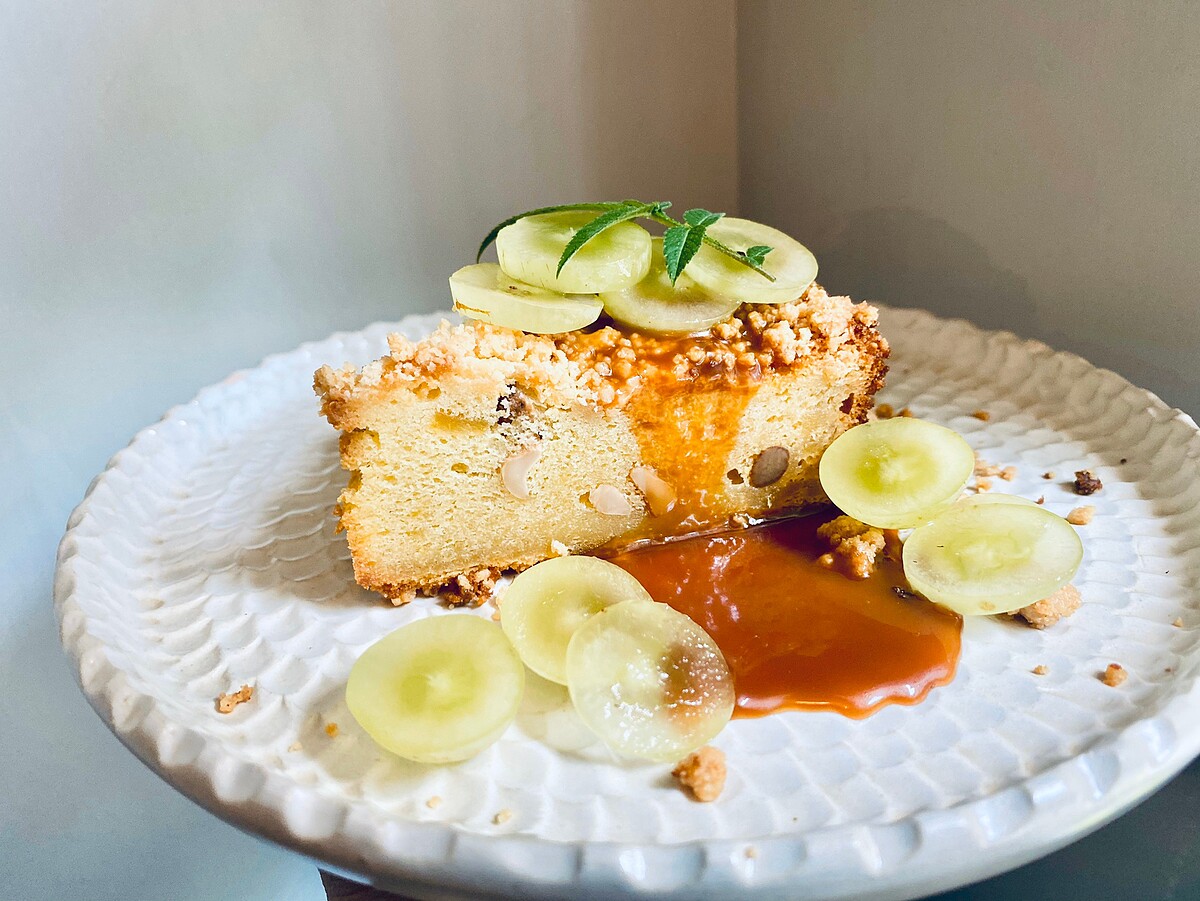 以往地瓜在甜點中十分少見,蛋宅將地瓜蒸成泥拌入蛋糕之中,接近磅蛋糕的扎實口感,加入堅果增添風味,最上方淋上太妃糖微甜滋味,即使不嗜甜的人也可以大口品嚐!