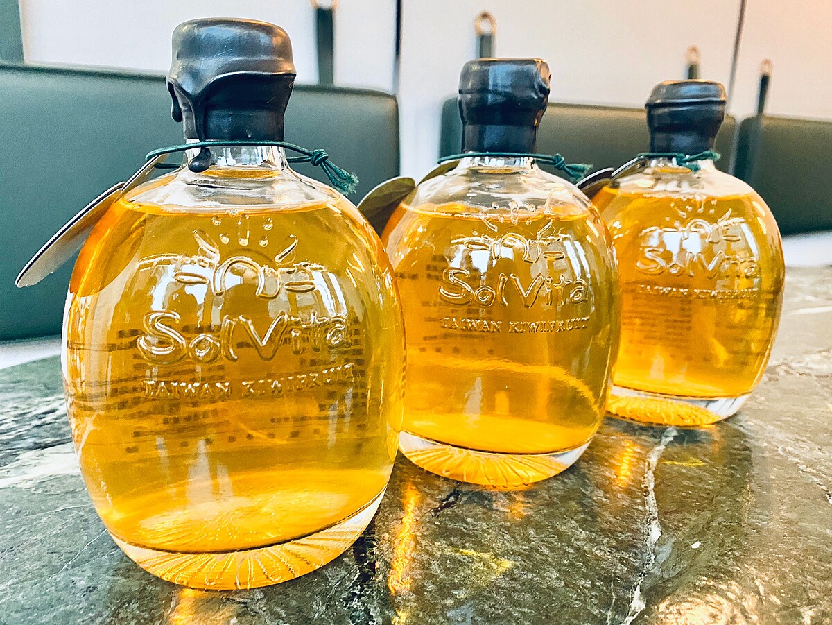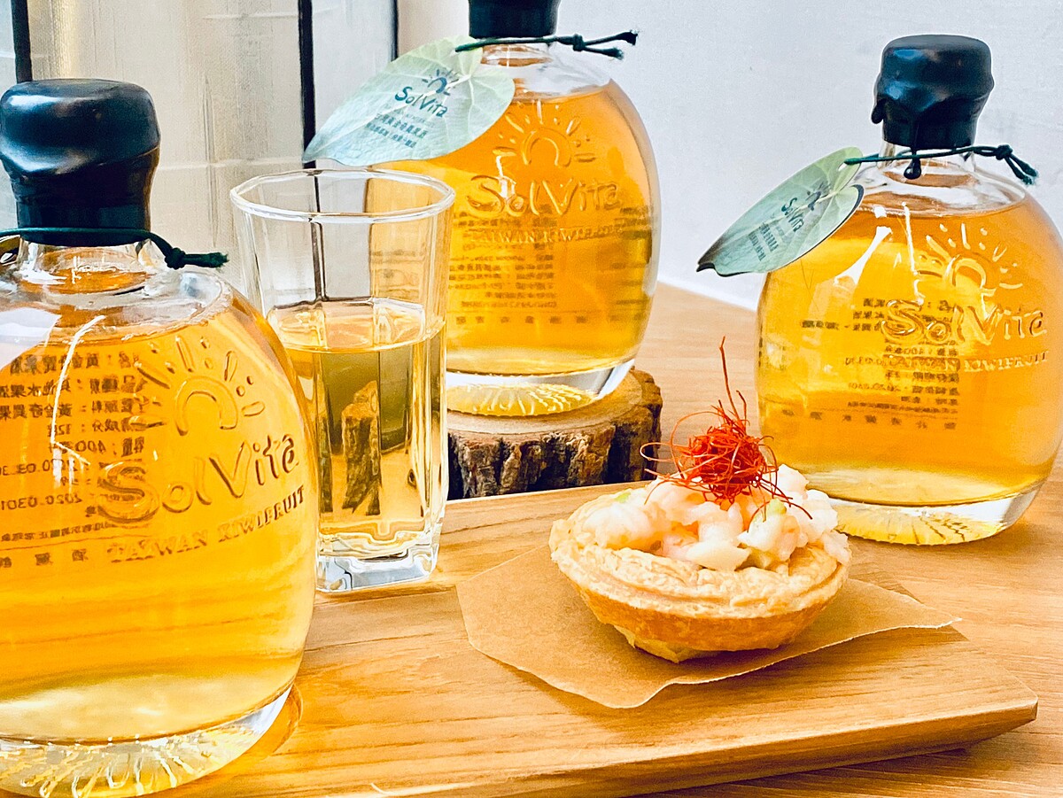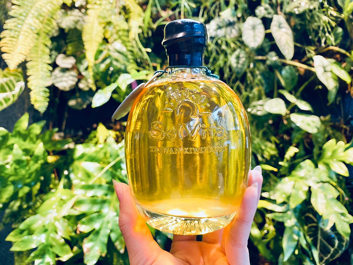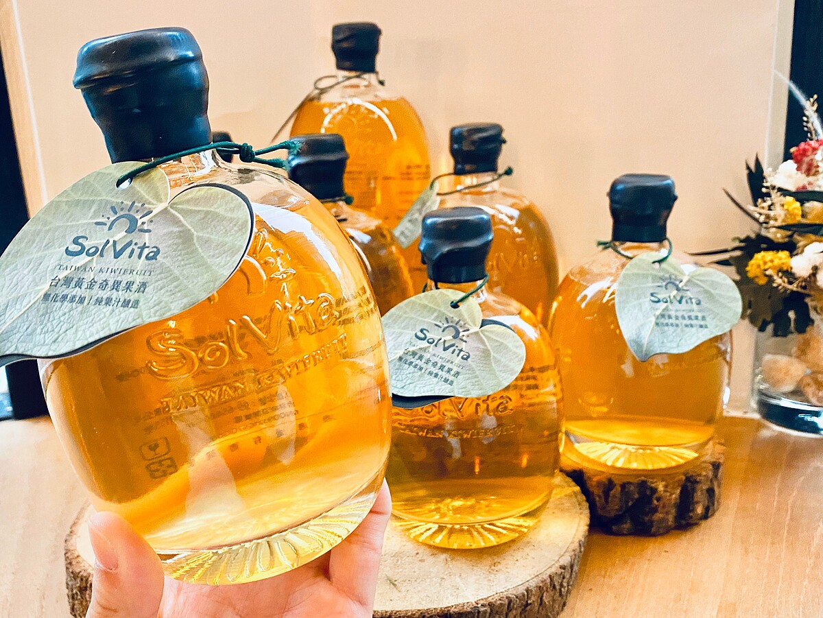 在地種植改良的黃金奇異果,歷經多次嘗試奇異果副產品研發,終於在歷時陳釀後,成為透亮金黃的首支臺灣奇異果酒!