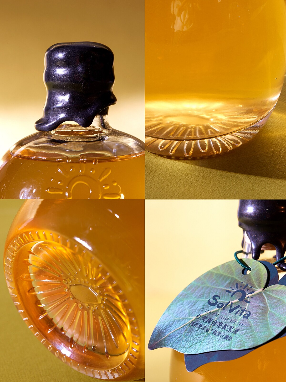 橢圓瓶身宛如奇異果果實形狀,酒標細絨觸感也與奇異果藤蔓葉片上的質地相似,吳恩均這樣說道:「每一支玻璃瓶都有些微差異,這也跟山上各自生長的奇異果一樣,它們不論在山林或在酒櫃,都依舊能保留奇異果實那份同中有異的自然之美,以及不變的好味道。」