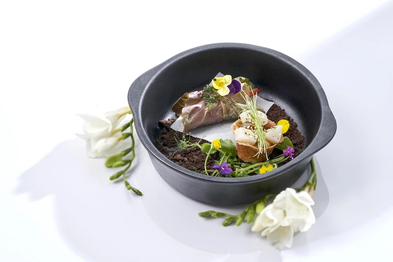 紫蘇葉包覆清爽的鮮蝦酪梨,搭配酥炸後的雲吞皮乘載香煎干貝與綜合野菇,整體風味清新爽口,視覺呈現更似春日花園的一隅。